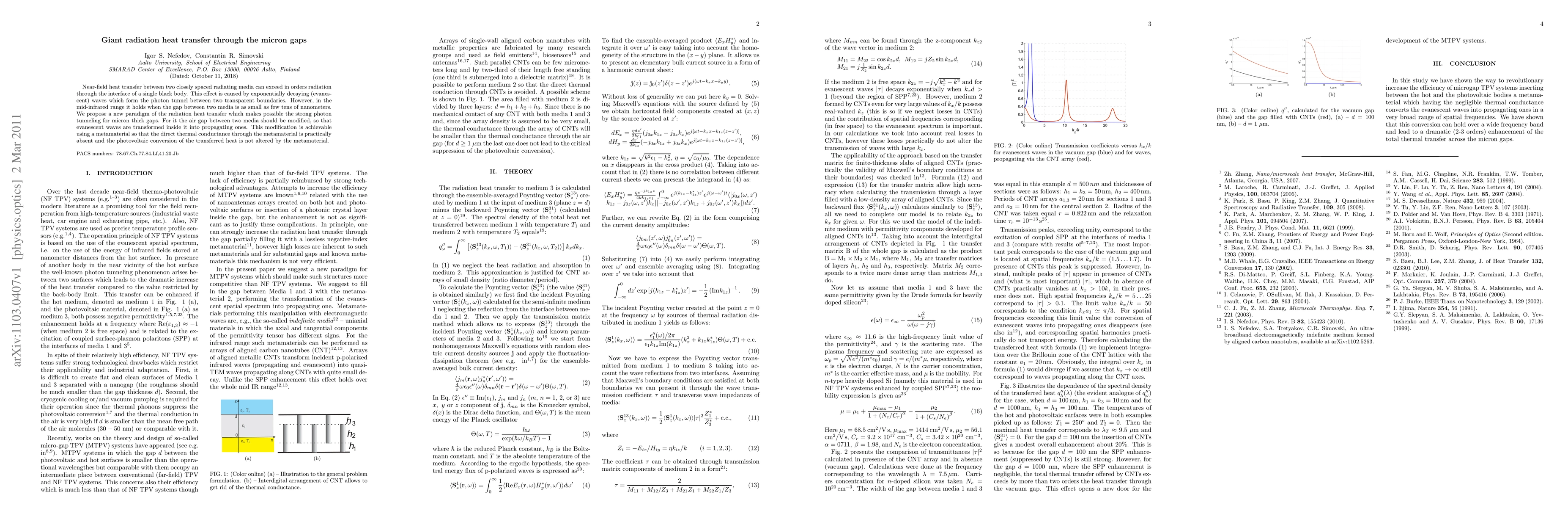 This paper proposes a new paradigm for giant radiation heat transfer through micron-sized gaps by transforming evanescent waves into propagating ones using metamaterials, enabling strong photon tunneling without significantly affecting thermal conductance or photovoltaic conversion.
