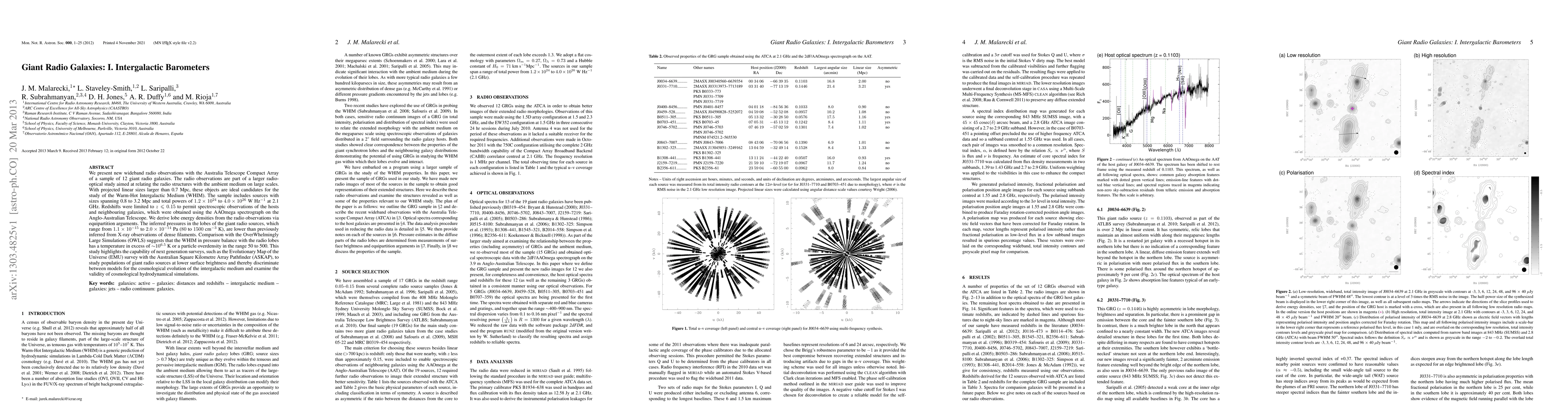 We present new wideband radio observations with the Australia Telescope Compact Array of a sample of 12 giant radio galaxies. The radio observations are part of a larger radio-optical study aimed at relating the radio structures with the ambient medium on large scales. With projected linear sizes larger than 0.7 Mpc, these objects are ideal candidates for the study of the Warm-Hot Intergalactic Medium (WHIM). The sample includes sources with sizes spanning 0.8 to 3.2 Mpc and total powers of 1.2*10^24 to 4.0*10^26 W Hz^-1 at 2.1 GHz. Redshifts were limited to z<0.15 to permit spectroscopic observations of the hosts and neighbouring galaxies, which were obtained using the AAOmega spectrograph on the Anglo-Australian Telescope. We derive lobe energy densities from the radio observations via equipartition arguments. The inferred pressures in the lobes of the giant radio sources, which range from 1.1*10^-15 to 2.0*10^-14 Pa (80 to 1500 cm^-3 K), are lower than previously inferred from X-ray observations of dense filaments. Comparison with the OverWhelmingly Large Simulations (OWLS) suggests that the WHIM in pressure balance with the radio lobes has a temperature in excess of ~10^6.5 K or a particle overdensity in the range 50 to 500. This study highlights the capability of next generation surveys, such as the Evolutionary Map of the Universe (EMU) survey with the Australian Square Kilometre Array Pathfinder (ASKAP), to study populations of giant radio sources at lower surface brightness and thereby discriminate between models for the cosmological evolution of the intergalactic medium and examine the validity of cosmological hydrodynamical simulations.