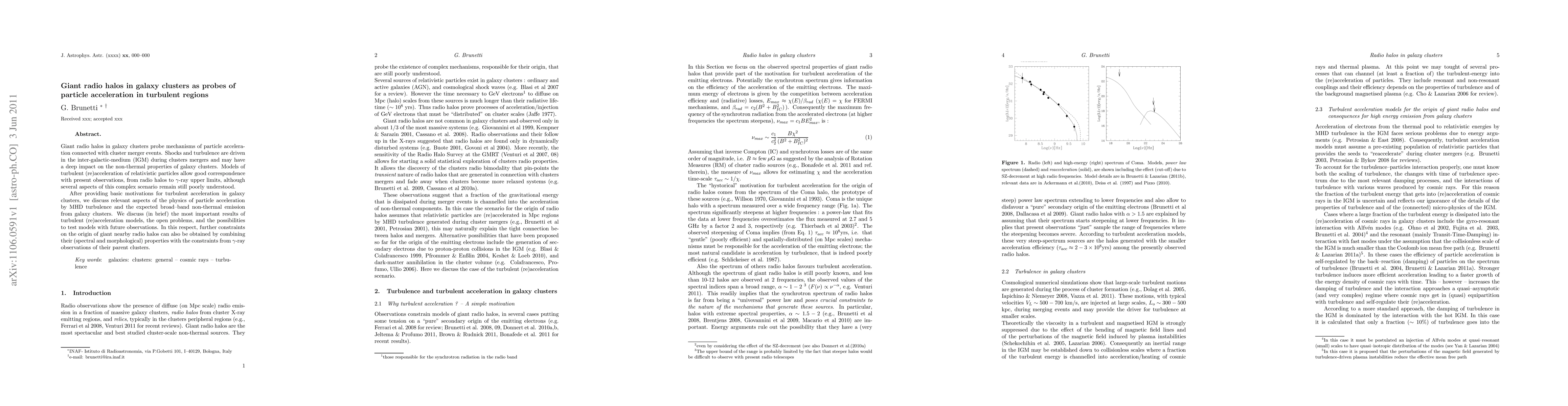 This paper explores giant radio halos in galaxy clusters as indicators of particle acceleration mechanisms linked to cluster mergers, emphasizing the role of turbulence and shocks in the inter-galactic medium. It discusses the physics of turbulent (re)acceleration and the potential for future observations to test these models.