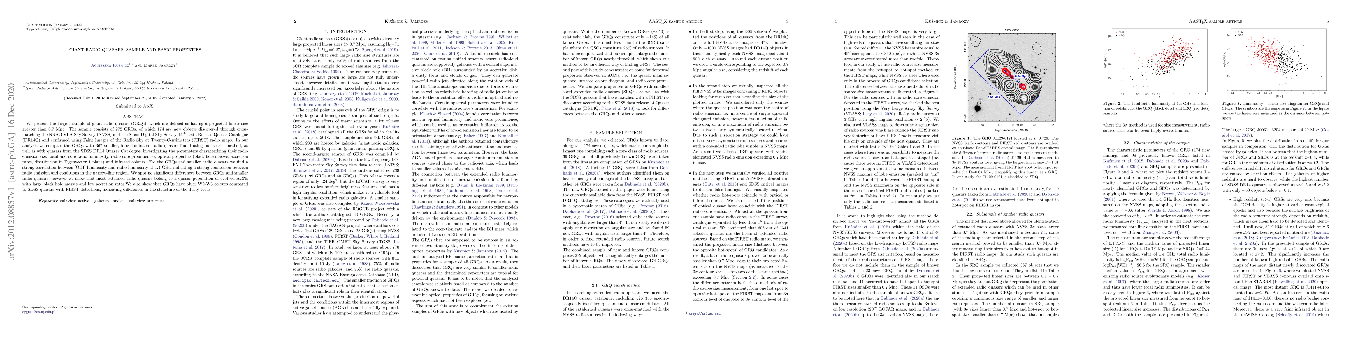 We present the largest sample of giant radio quasars (GRQs), which are defined as having a projected linear size greater than 0.7 Mpc. The sample consists of 272 GRQs, of which 174 are new objects discovered through cross-matching the NRAO VLA Sky Survey (NVSS) and the Sloan Digital Sky Survey 14$^{\rm th}$ Data Release Quasar Catalogue (DR14Q) and confirmed using Faint Images of the Radio Sky at Twenty-Centimeters (FIRST) radio maps. In our analysis we compare the GRQs with 367 smaller, lobe-dominated radio quasars found using our search method, as well as with quasars from the SDSS DR14 Quasar Catalogue, investigating the parameters characterizing their radio emission (i.e. total and core radio luminosity, radio core prominence), optical properties (black hole masses, accretion rates, distribution in Eigenvector 1 plane) and infrared colours. For the GRQs and smaller radio quasars we find a strong correlation between [OIII] luminosity and radio luminosity at 1.4 GHz, indicating a strong connection between radio emission and conditions in the narrow-line region. We spot no significant differences between GRQs and smaller radio quasars, however we show that most extended radio quasars belong to a quasar population of evolved AGNs with large black hole masses and low accretion rates. We also show that GRQs have bluer W2-W3 colours compared to SDSS quasars with FIRST detections, indicating differences in the structure of the dusty torus.
