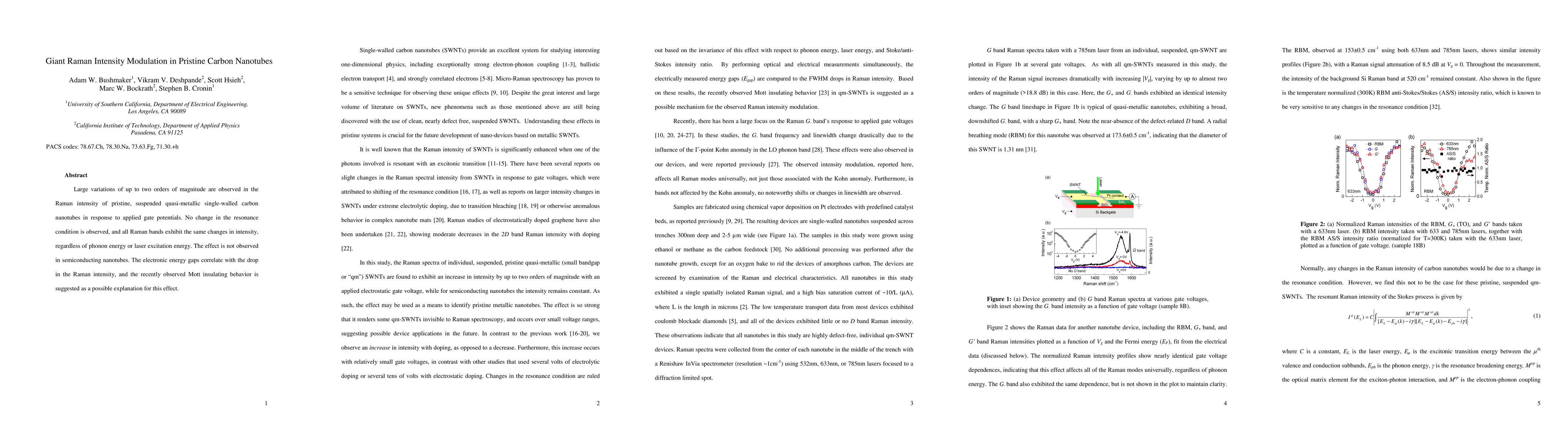 This study reveals significant Raman intensity modulation in pristine, suspended quasi-metallic single-walled carbon nanotubes under applied gate potentials, with no change in resonance conditions. The phenomenon correlates with electronic energy gaps and may be explained by Mott insulating behavior.