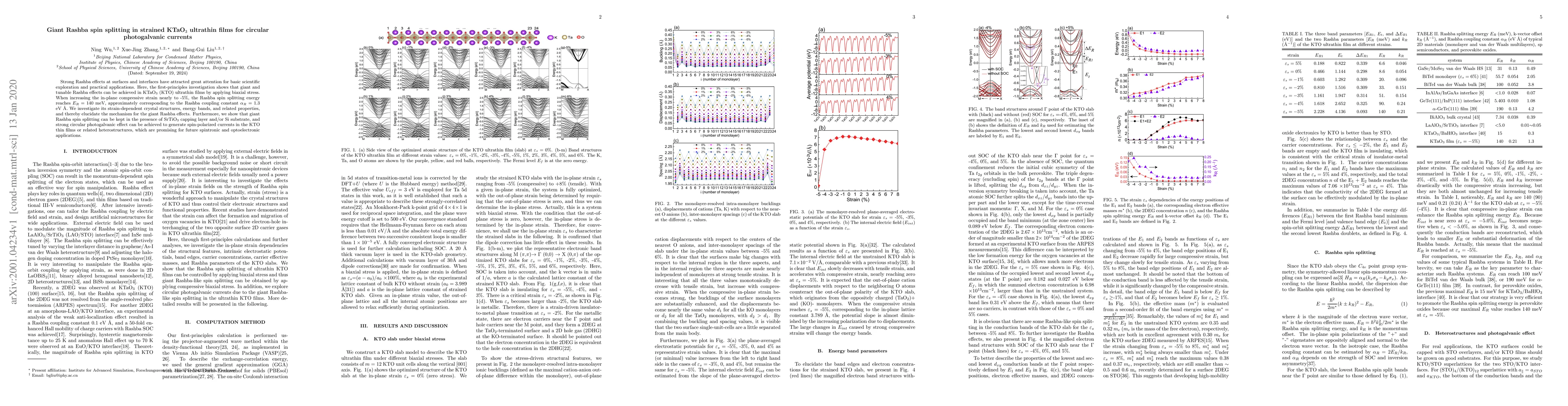 This paper investigates giant and tunable Rashba spin splitting in strained KTaO$_3$ ultrathin films, achieving an energy of $E_{R}=140$ meV under nearly -5% in-plane compressive strain. The study reveals the mechanism behind these effects and demonstrates their potential for generating spin-polarized currents via circular photogalvanic effect, promising for future spintronic and optoelectronic applications.