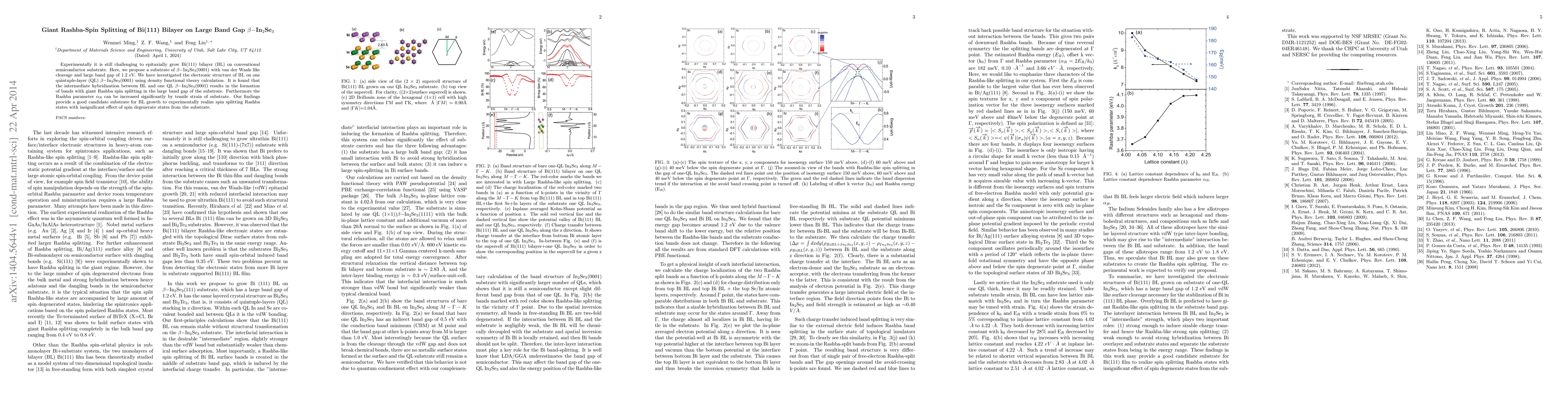 Experimentally it is still challenging to epitaxially grow Bi(111) bilayer (BL) on conventional semiconductor substrate. Here, we propose a substrate of $\beta-$In$_2$Se$_3$(0001) with van der Waals like cleavage and large band gap of 1.2~eV. We have investigated the electronic structure of BL on one quintuple-layer (QL) $\beta-$In$_2$Se$_3$(0001) using density functional theory calculation. It is found that the intermediate hybridization between BL and one QL $\beta-$In$_2$Se$_3$(0001) results in the formation of bands with giant Rashba spin splitting in the large band gap of the substrate. Furthermore the Rashba parameter $\alpha_R$ can be increased significantly by tensile strain of substrate. Our findings provide a good candidate substrate for BL growth to experimentally realize spin splitting Rashba states with insignificant effect of spin degenerate states from the substrate.