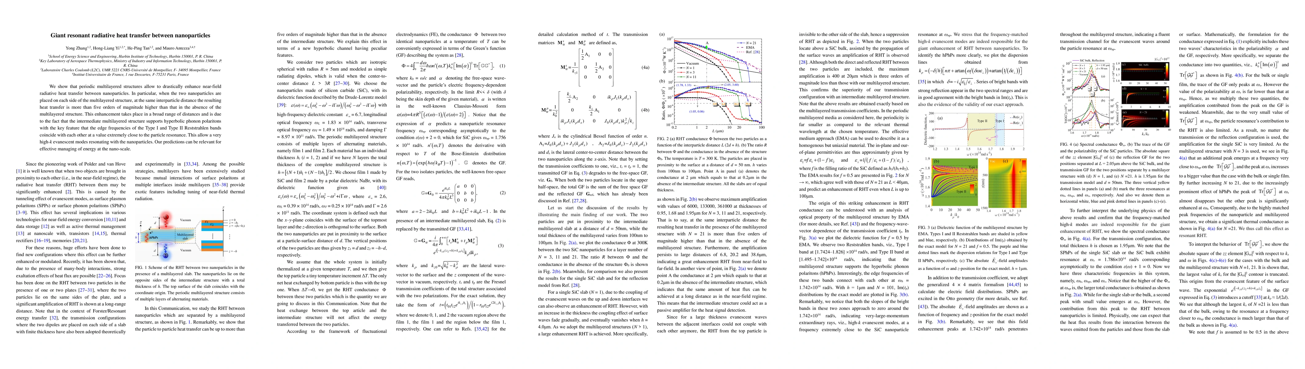 This paper demonstrates that multilayered structures can significantly boost near-field radiative heat transfer between nanoparticles, achieving over five orders of magnitude enhancement compared to traditional methods. The enhancement is due to hyperbolic phonon polaritons supported by the multilayered structure, which align the edge frequencies of Reststrahlen bands with nanoparticle resonances.