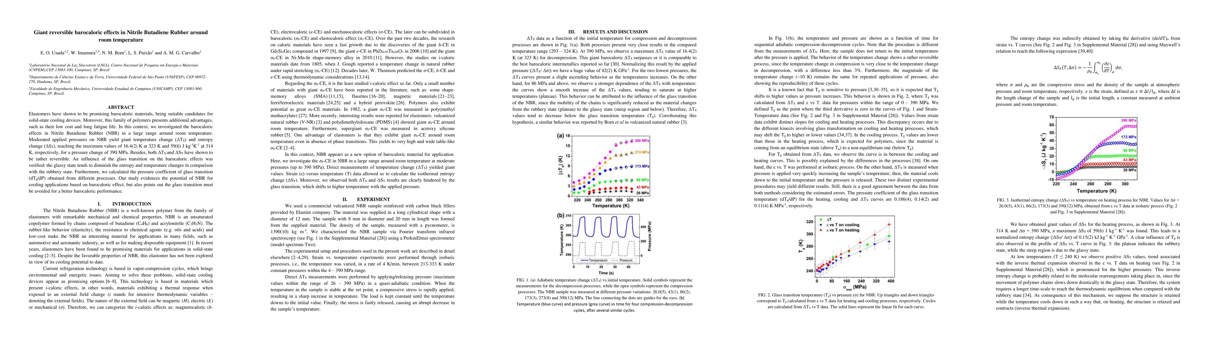 Elastomers have shown to be promising barocaloric materials, being suitable candidates for solid-state cooling devices. Moreover, this family of polymers presents additional advantages, such as their low cost and long fatigue life. In this context, we investigated the barocaloric effects in Nitrile Butadiene Rubber (NBR) in a large range around room temperature. Moderated applied pressures on NBR yield giant temperature change ({\Delta}TS) and entropy change ({\Delta}ST), reaching the maximum values of 16.4(2) K at 323 K and 59(6) J kg-1K-1 at 314 K, respectively, for a pressure change of 390 MPa. Besides, both {\Delta}TS and {\Delta}ST have shown to be rather reversible. An influence of the glass transition on the barocaloric effects was verified: the glassy state tends to diminish the entropy and temperature changes in comparison with the rubbery state. Furthermore, we calculated the pressure coefficient of glass transition (dTg/dP) obtained from different processes. Our study evidences the potential of NBR for cooling applications based on barocaloric effect, but also points out the glass transition must be avoided for a better barocaloric performance.