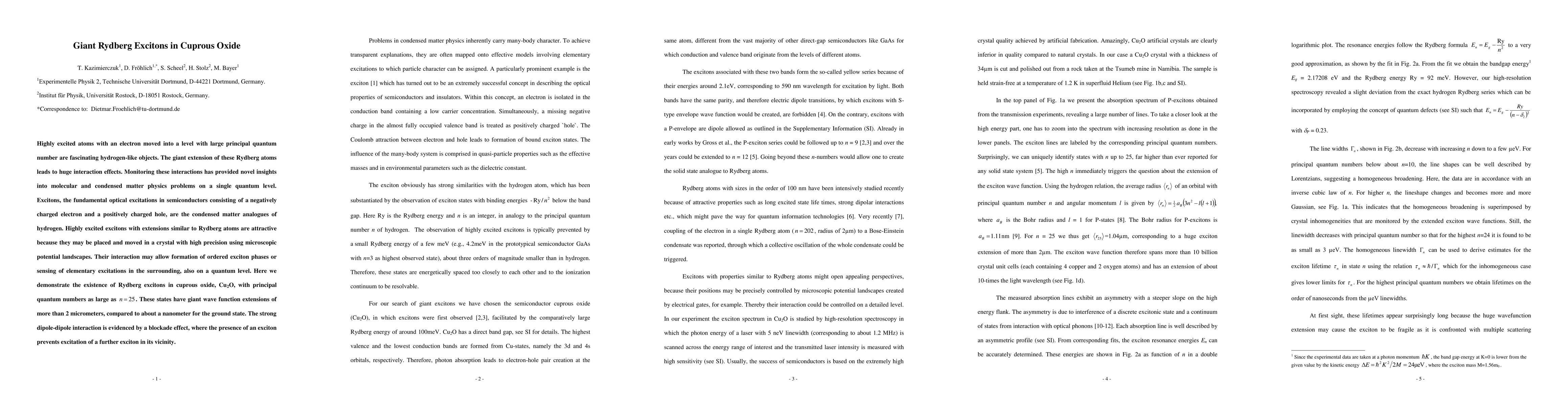 This research demonstrates the existence of giant Rydberg excitons in cuprous oxide with principal quantum numbers up to n=25, showing wave function extensions over 2 micrometers and strong dipole-dipole interactions evidenced by a blockade effect preventing the excitation of additional excitons nearby.