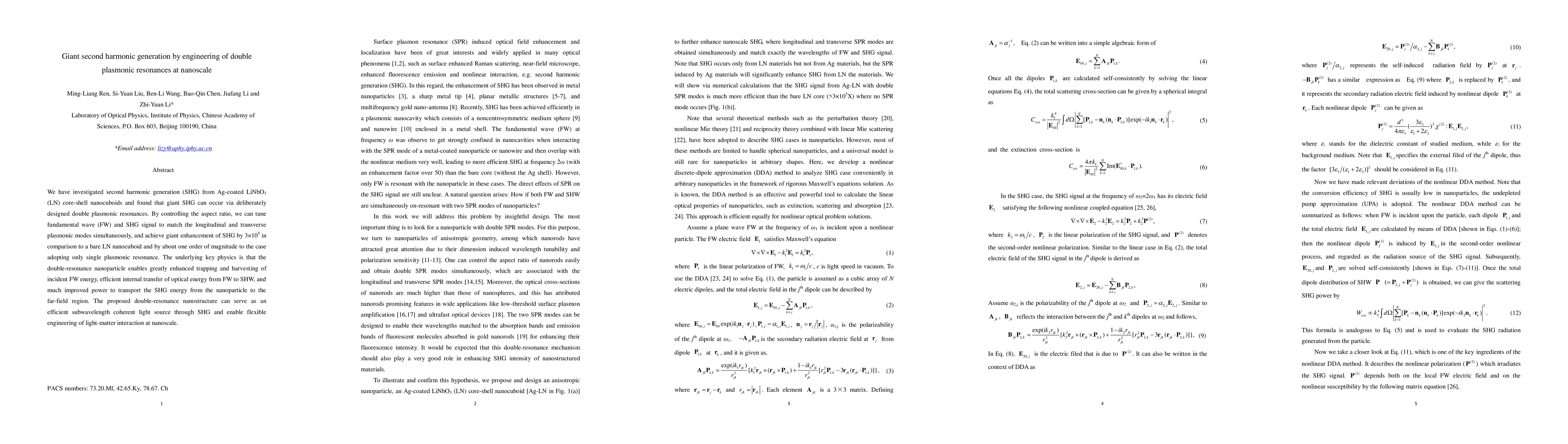This research demonstrates giant second harmonic generation (SHG) in Ag-coated LiNbO3 nanocuboids via engineered double plasmonic resonances, achieving an enhancement of SHG by over five orders of magnitude compared to bare nanocuboids. The key mechanism involves efficient trapping and energy transfer enabled by the double-resonance nanoparticle structure.