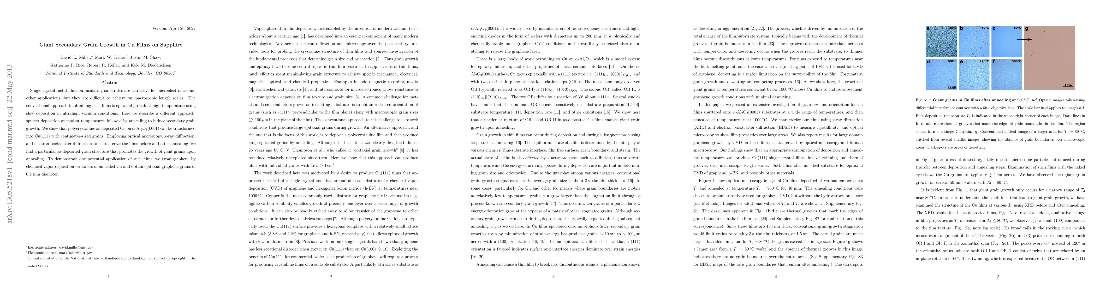 This paper presents a novel method for creating large-grained Cu films on sapphire using sputter deposition followed by annealing, resulting in centimeter-sized Cu(111) grains. The study demonstrates the potential application of these films by growing graphene on them, achieving epitaxial graphene grains of 0.2 mm diameter.