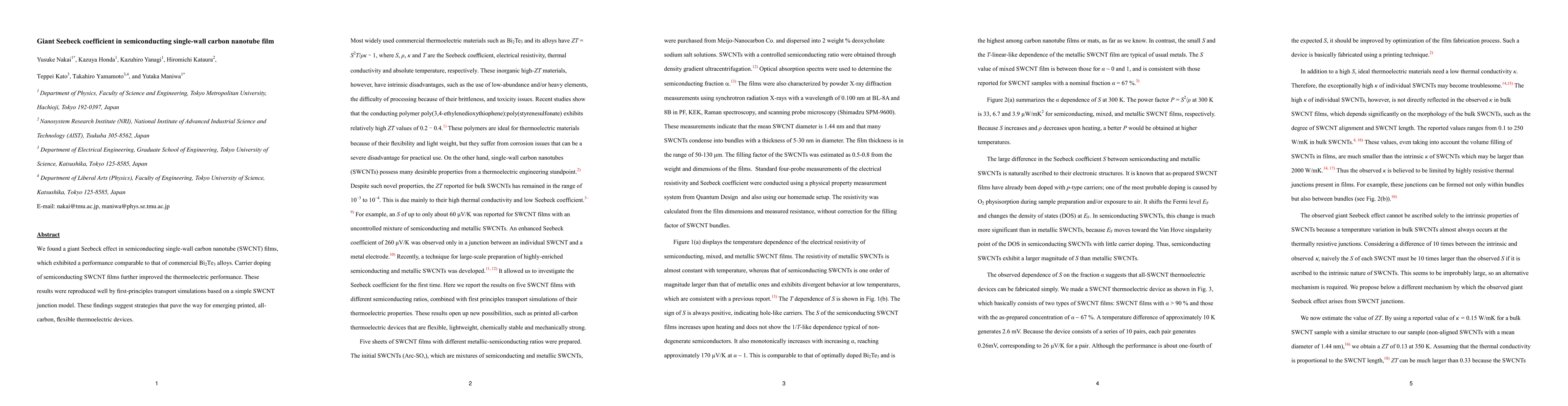 This study reveals a remarkably high Seebeck coefficient in semiconducting single-wall carbon nanotube films, rivaling commercial thermoelectric materials like Bi2Te3. Enhanced performance was achieved through carrier doping, supported by accurate first-principles simulations, indicating potential for flexible, printed all-carbon thermoelectric devices.