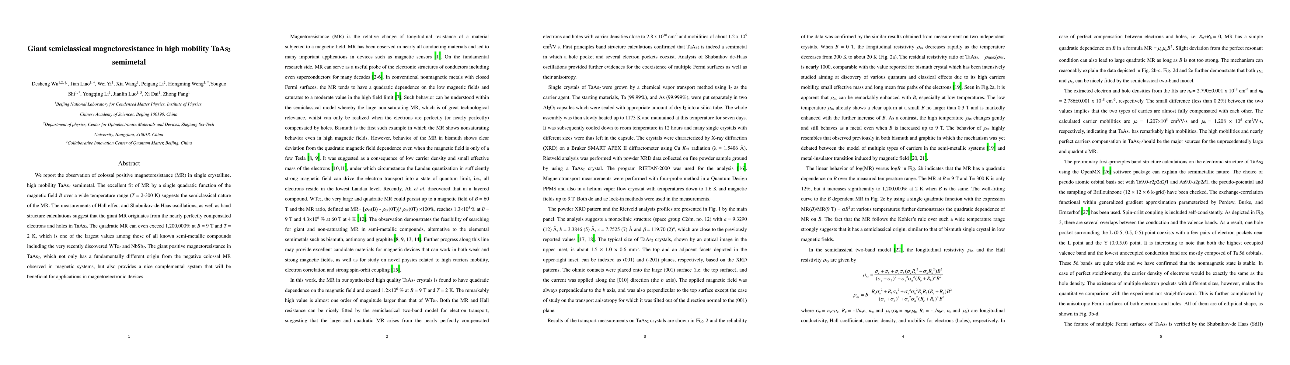 The study demonstrates a semiclassical two-band model fitting the giant MR in TaAs2, consistent with the model for WTe2, highlighting the role of high carrier mobilities and nearly perfect carrier compensation in generating unprecedentedly large and quadratic MR.