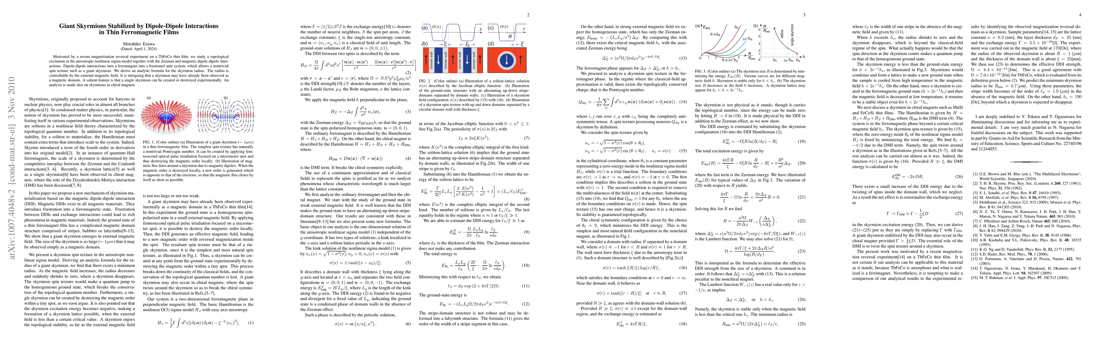 Motivated by a recent magnetization reversal experiment on a TbFeCo thin film, we study a topological excitation in the anisotropic nonlinear sigma model together with the Zeeman and magnetic dipole-dipole interactions. Dipole-dipole interactions turn a ferromagnet into a frustrated spin system, which allows a nontrivial spin texture such as a giant skyrmion. We derive an analytic formula for the skyrmion radius. The radius is controllable by the external magnetic field. It is intriguing that a skyrmion may have already been observed as a magnetic domain. A salient feature is that a single skyrmion can be created or destroyed experimentally. An analysis is made also on skyrmions in chiral magnets.