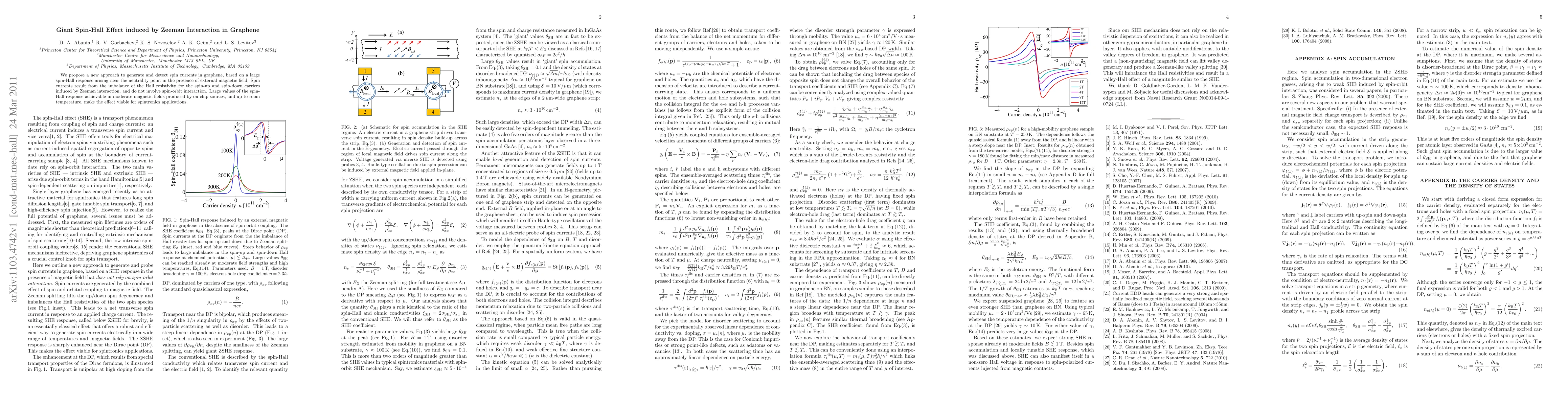 This paper proposes a method to generate and detect spin currents in graphene through a significant spin-Hall effect near the neutrality point under an external magnetic field, driven by Zeeman interaction rather than spin-orbit interaction. The large spin-Hall response achievable in moderate magnetic fields suggests potential for spintronics applications at room temperature.