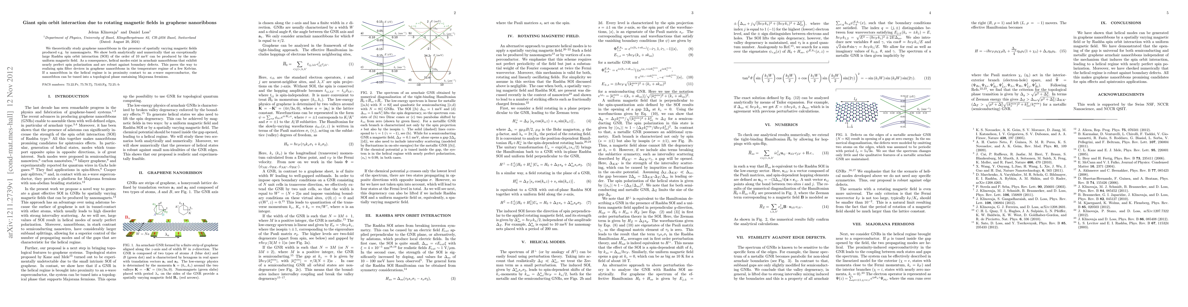 We theoretically study graphene nanoribbons in the presence of spatially varying magnetic fields produced e.g. by nanomagnets. We show both analytically and numerically that an exceptionally large Rashba spin orbit interaction (SOI) of the order of 10 meV can be produced by the non-uniform magnetic field. As a consequence, helical modes exist in armchair nanoribbons that exhibit nearly perfect spin polarization and are robust against boundary defects. This paves the way to realizing spin filter devices in graphene nanoribbons in the temperature regime of a few Kelvins. If a nanoribbon in the helical regime is in proximity contact to an s-wave superconductor, the nanoribbon can be tuned into a topological phase sustaining Majorana fermions.