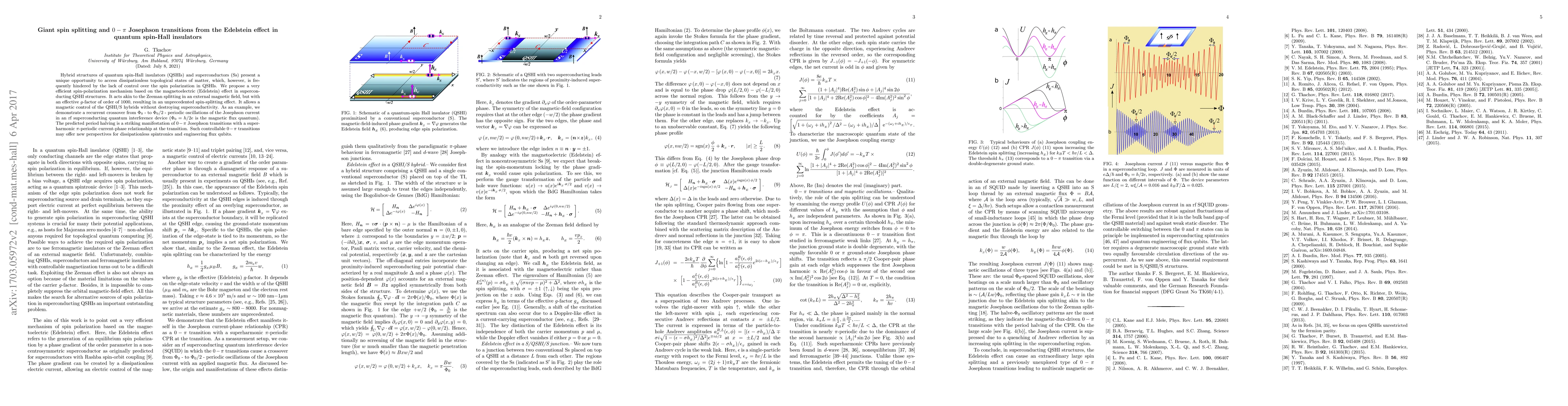 This paper proposes a spin-polarization mechanism in quantum spin-Hall insulators (QSHIs) using the Edelstein effect, achieving giant spin splitting and enabling $0 - \pi$ Josephson transitions without disrupting superconductivity. The method allows magnetic control of QSHI/superconductor hybrids, potentially advancing dissipationless spintronics and flux qubit engineering.