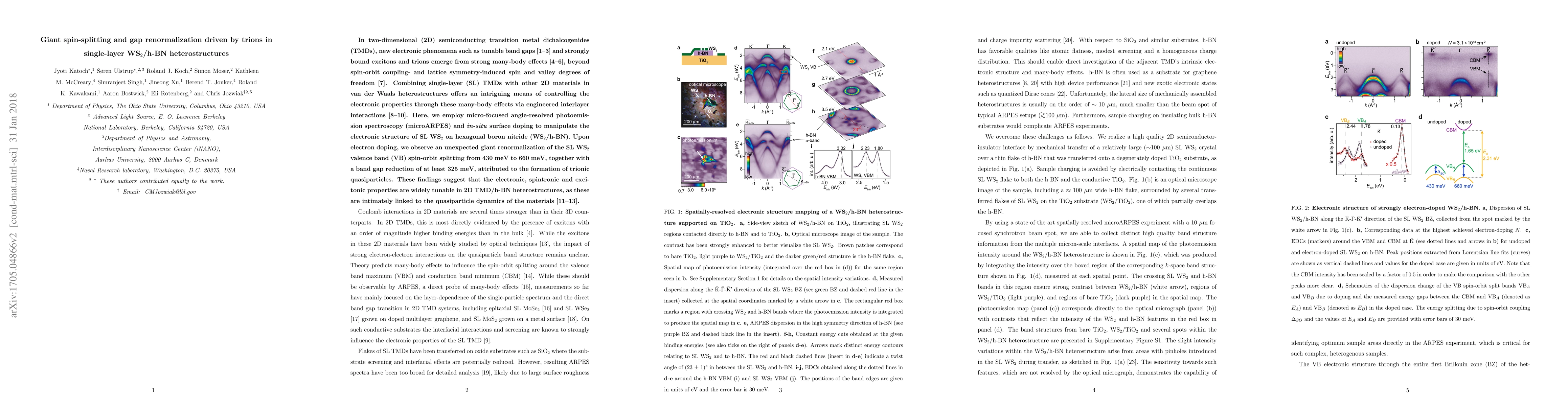 This paper reports on the giant spin-splitting and gap renormalization in single-layer WS$_2$/h-BN heterostructures due to trions, achieved via microARPES and in-situ surface doping, revealing significant tunability of electronic properties.