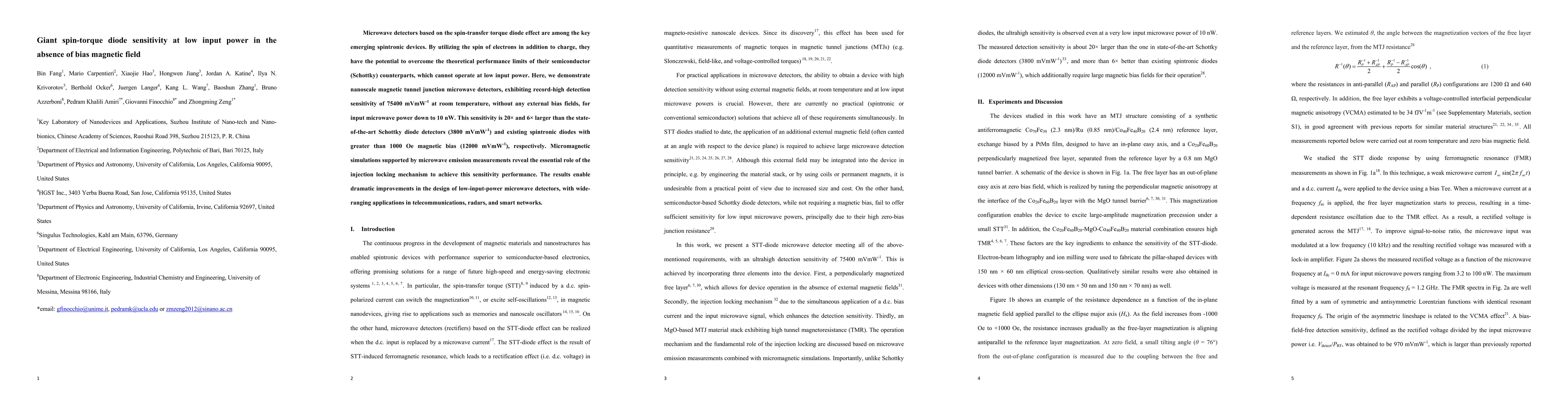 This paper demonstrates nanoscale microwave detectors with exceptional spin-torque diode sensitivity at low input power, achieving 75400 mV mW$^{-1}$ without external bias fields, significantly outperforming traditional Schottky diodes and existing spintronic diodes. The enhanced sensitivity is attributed to injection locking, promising advancements in low-power microwave detection for telecommunications and radars.