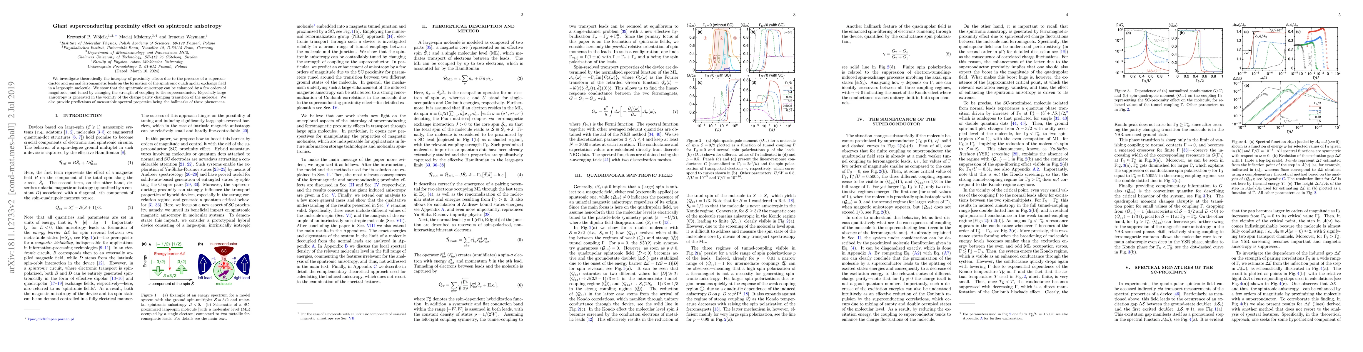 We investigate theoretically the interplay of proximity effects due to the presence of a superconductor and normal ferromagnetic leads on the formation of the spintronic quadrupolar exchange field in a large-spin molecule. We show that the spintronic anisotropy can be enhanced by a few orders of magnitude, and tuned by changing the strength of coupling to the superconductor. Especially large anisotropy is generated in the vicinity of the charge parity changing transition of the molecule. We also provide predictions of measurable spectral properties being the hallmarks of these phenomena.