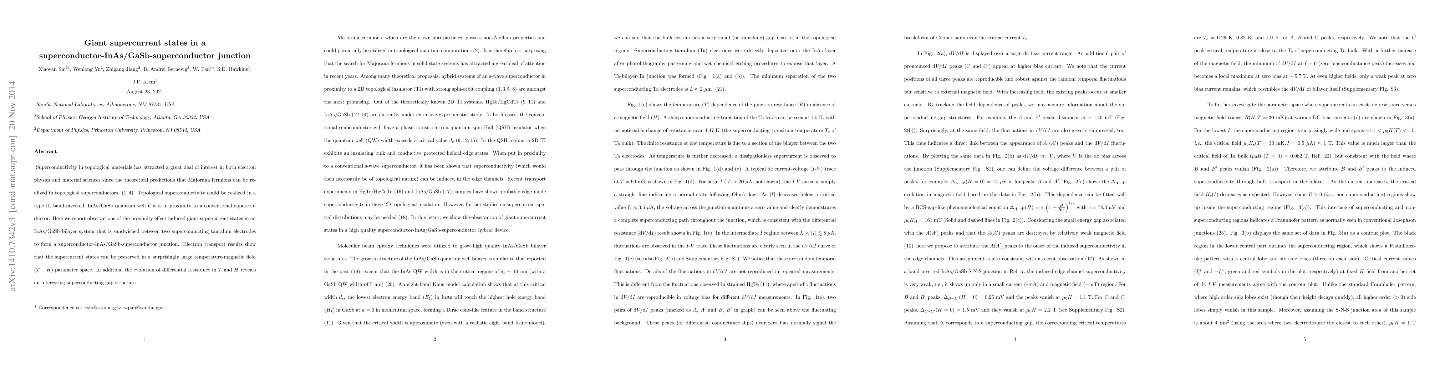 This paper reports on the discovery of giant supercurrent states in a superconductor-InAs/GaSb-superconductor junction, demonstrating the proximity effect in a type II, band-inverted quantum well. The observed supercurrents are stable over a broad temperature-magnetic field range, and the study reveals an intriguing superconducting gap structure.