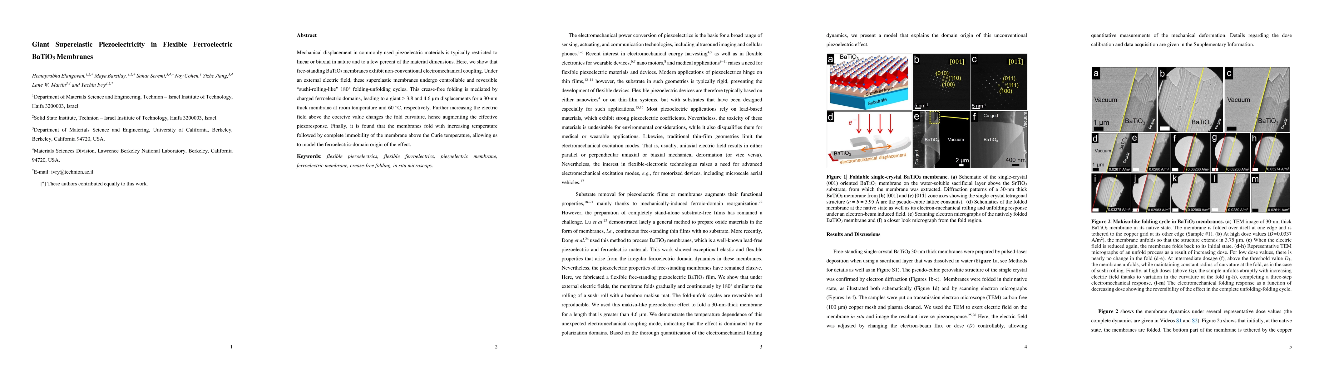 Mechanical displacement in commonly used piezoelectric materials is typically restricted to linear or biaxial in nature and to a few percent of the material dimensions. Here, we show that free-standing BaTiO$_3$ membranes exhibit non-conventional electromechanical coupling. Under an external electric field, these superelastic membranes undergo controllable and reversible 'sushi-rolling-like' 180$^\circ$ folding-unfolding cycles. This crease-free folding is mediated by charged ferroelectric domains, leading to a giant > 3.8 and 4.6 $\mu$m displacements for a 30-nm thick membrane at room temperature and 60$^\circ$C, respectively. Further increasing the electric field above the coercive value changes the fold curvature, hence augmenting the effective piezoresponse. Finally, it is found that the membranes fold with increasing temperature followed by complete immobility of the membrane above the Curie temperature, allowing us to model the ferroelectric-domain origin of the effect.
