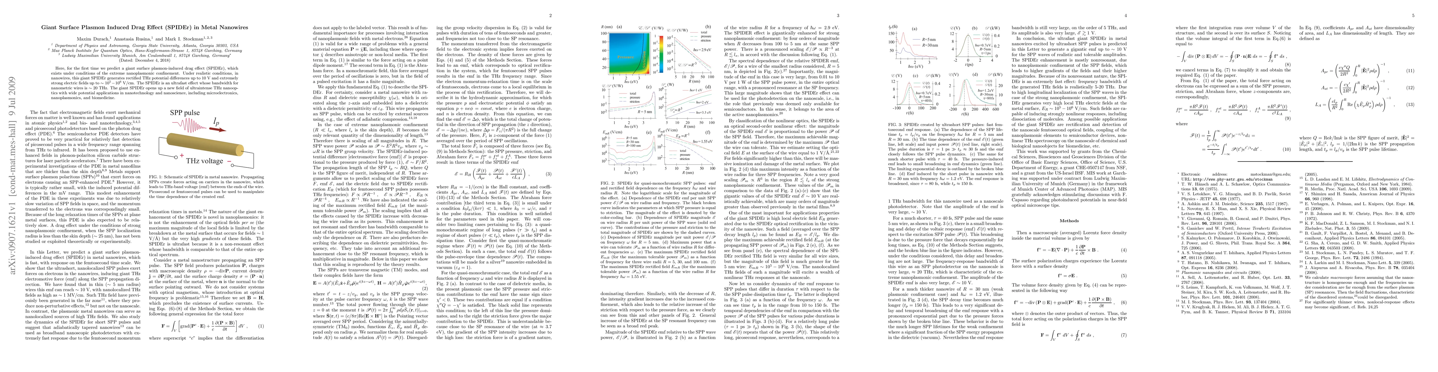 This paper predicts the existence of a giant surface plasmon-induced drag effect (SPIDEr) in metal nanowires, generating rectified THz potential differences and strong electric fields. The ultrafast SPIDEr has potential applications in nanotechnology, microelectronics, nanoplasmonics, and biomedicine.