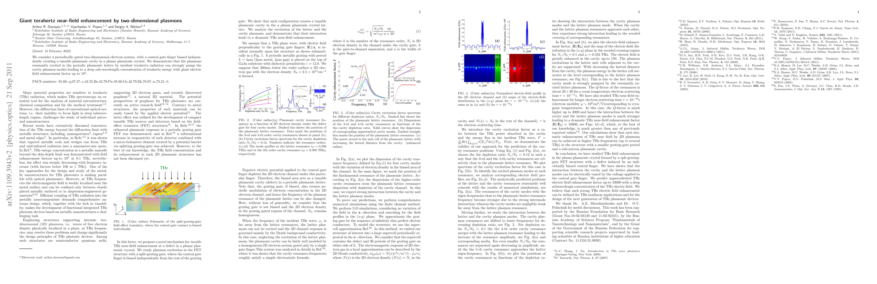 This research demonstrates a periodically gated two-dimensional electron system that creates a tunable plasmonic cavity, resulting in giant terahertz near-field enhancements up to 10,000 times through resonant excitation by terahertz radiation. The study highlights strong coupling between incident terahertz waves and cavity plasmon modes.