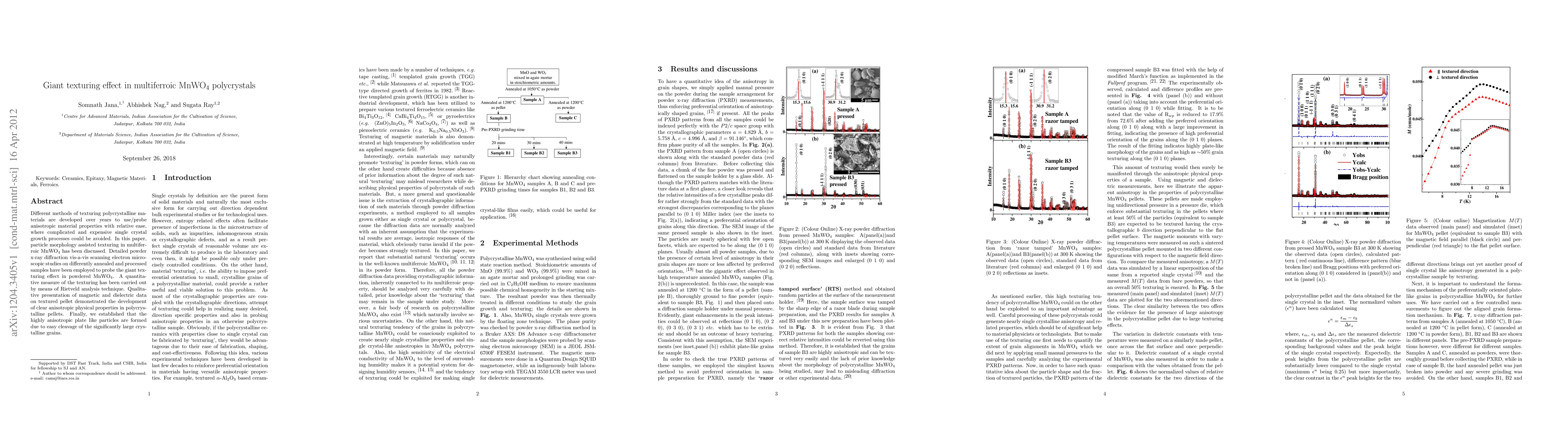 Different methods of texturing polycrystalline materials are developed over years to use/probe anisotropic material properties with relative ease, where complicated and expensive single crystal growth processes could be avoided. In this paper, particle morphology assisted texturing in multiferroic MnWO$_4$ has been discussed. Detailed powder x-ray diffraction vis-a-vis scanning electron microscopic studies on differently annealed and processed samples have been employed to probe the giant texturing effect in powdered MnWO$_4$. A quantitative measure of the texturing has been carried out by means of Rietveld analysis technique. Qualitative presentation of magnetic and dielectric data on textured pellet demonstrated the development of clear anisotropic physical properties in polycrystalline pellets. Finally, we established that the highly anisotropic plate like particles are formed due to easy cleavage of the significantly large crystalline grains.