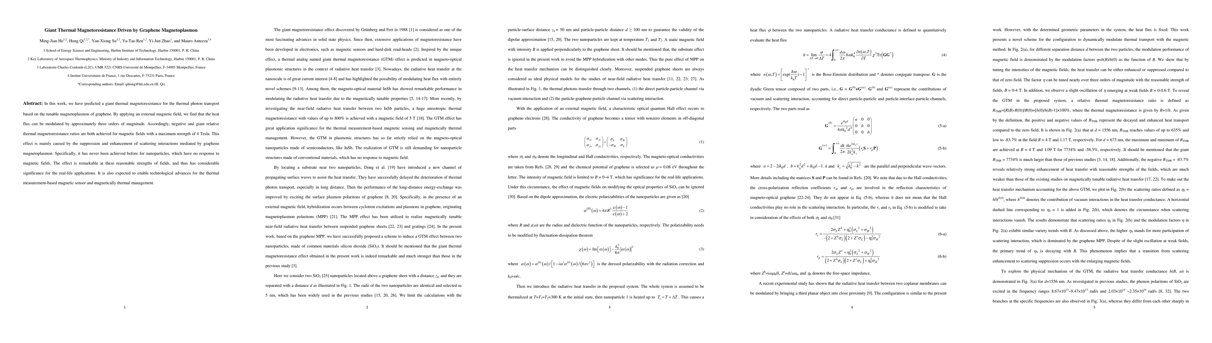 In this work, we have predicted a giant thermal magnetoresistance for the thermal photon transport based on the tunable magnetoplasmon of graphene. By applying an external magnetic field, we find that the heat flux can be modulated by approximately three orders of magnitude. Accordingly, negative and giant relative thermal magnetoresistance ratios are both achieved for magnetic fields with a maximum strength of 4 Tesla. This effect is mainly caused by the suppression and enhancement of scattering interactions mediated by graphene magnetoplasmon. Specifically, it has never been achieved before for nanoparticles, which have no response to magnetic fields. The effect is remarkable at these reasonable strengths of fields, and thus has considerable significance for the real-life applications. It is also expected to enable technological advances for the thermal measurement-based magnetic sensor and magnetically thermal management.