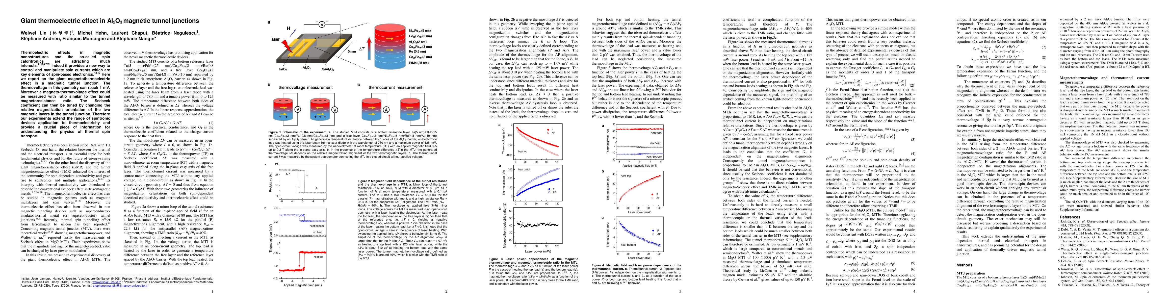 MTJs were prepared with a bottom reference layer and a free layer separated by a 2 nm thick Al2O3 barrier. Thermoelectric measurements were conducted by heating the top or bottom lead with a laser diode, and thermovoltage and thermotunnel current were measured using a nanovoltmeter and sourcemeter, respectively.