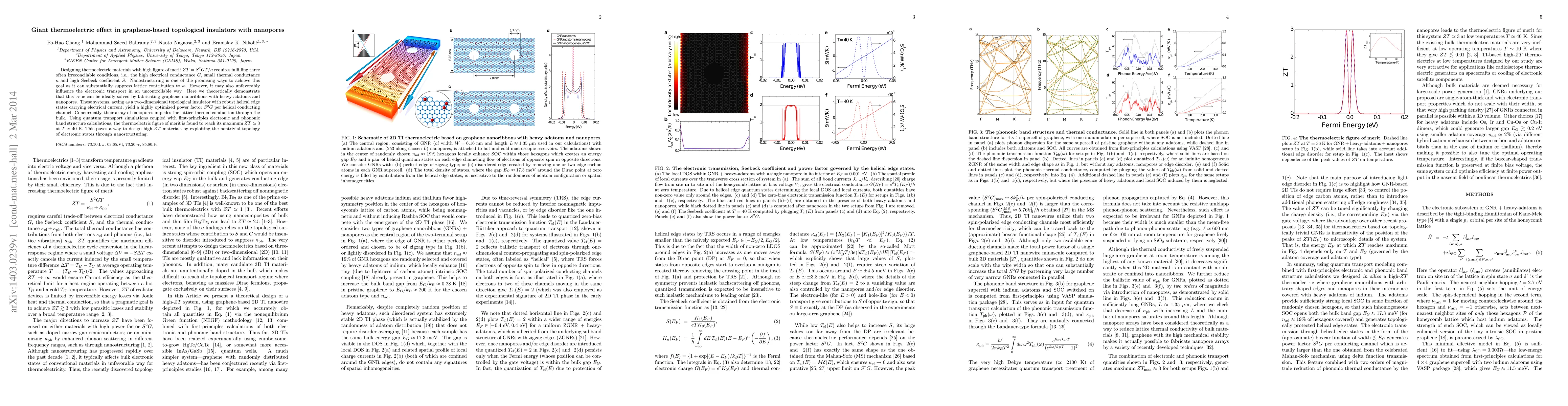 This paper demonstrates that graphene nanoribbons with heavy adatoms and nanopores can achieve a giant thermoelectric effect, optimizing the power factor while suppressing lattice thermal conduction, resulting in a high thermoelectric figure of merit $ZT \simeq 3$ at $40$ K. This approach leverages topological insulator properties and nanostructuring for advanced thermoelectric material design.