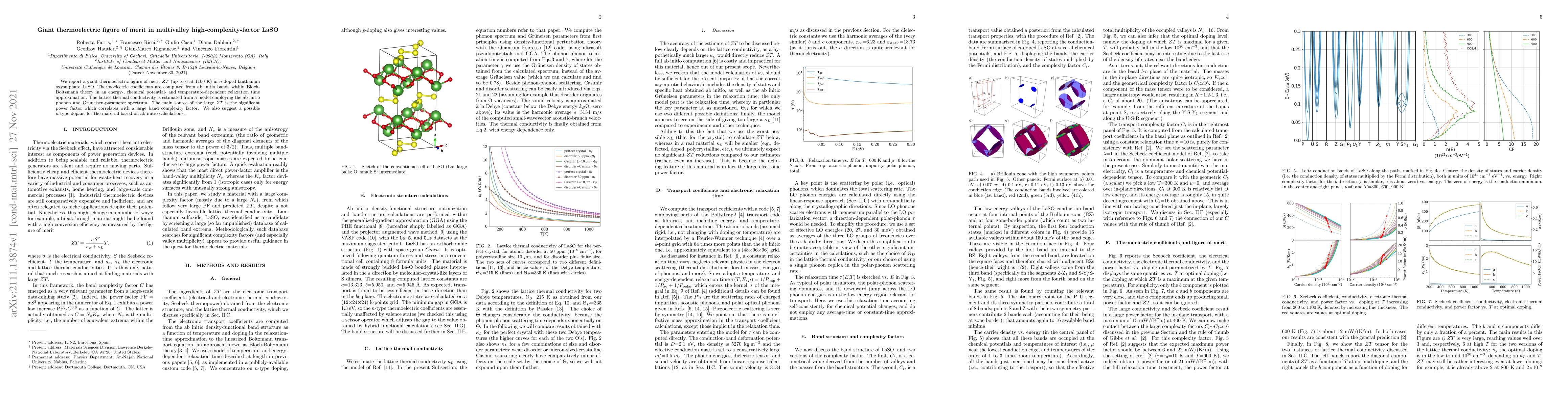 We report a giant thermoelectric figure of merit $ZT$ (up to 6 at 1100 K) in $n$-doped lanthanum oxysulphate LaSO. Thermoelectric coefficients are computed from ab initio bands within Bloch-Boltzmann theory in an energy-, chemical potential- and temperature-dependent relaxation time approximation. The lattice thermal conductivity is estimated from a model employing the ab initio phonon and Gr\"uneisen-parameter spectrum. The main source of the large $ZT$ is the significant power factor which correlates with a large band complexity factor. We also suggest a possible $n$-type dopant for the material based on ab initio calculations.