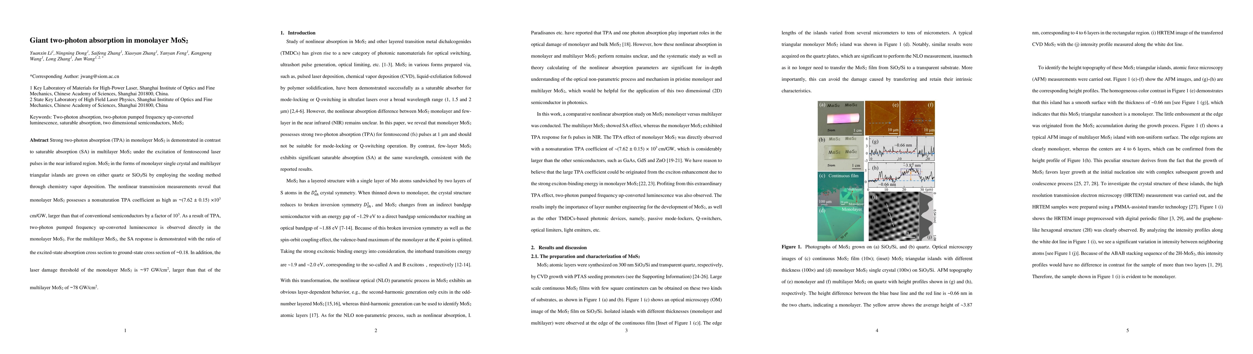 This paper demonstrates strong two-photon absorption in monolayer MoS2, significantly greater than in multilayer MoS2, with monolayers showing a giant nonsaturation coefficient and higher laser damage threshold. Two-photon pumped frequency up-converted luminescence is observed in monolayers, contrasting with saturable absorption in multilayers.