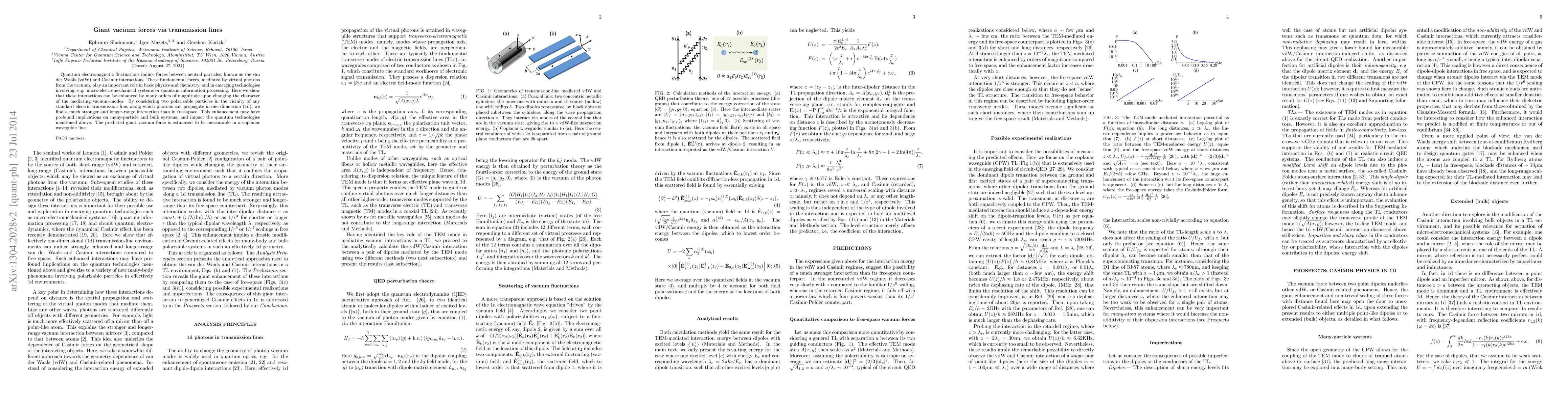 Quantum electromagnetic fluctuations induce forces between neutral particles, known as the van der Waals (vdW) and Casimir interactions. These fundamental forces, mediated by virtual photons from the vacuum, play an important role in basic physics and chemistry, and in emerging technologies involving, e.g. micro-electromechanical systems or quantum information processing. Here we show that these interactions can be enhanced by many orders of magnitude upon changing the character of the mediating vacuum-modes. By considering two polarizable particles in the vicinity of any standard electric transmission line, along which photons can propagate in one dimension (1d), we find a much stronger and longer-range interaction than in free-space. This enhancement may have profound implications on many-particle and bulk systems, and impact the quantum technologies mentioned above. The predicted giant vacuum force is estimated to be measurable in a coplanar waveguide line.