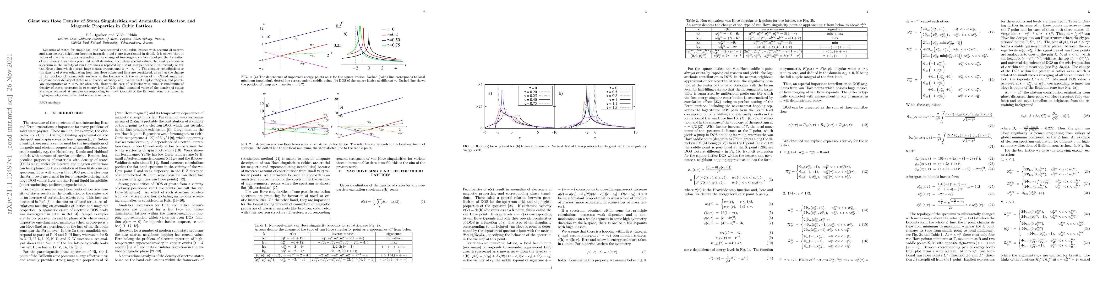 This paper investigates the density of states in simple cubic and base-centered cubic lattices, revealing giant van Hove singularities at specific ratios of hopping integrals. It finds that these singularities lead to anomalous electron and magnetic properties, with maximal density of states occurring at inner high-symmetry \textbf{k}-points rather than at zone faces.