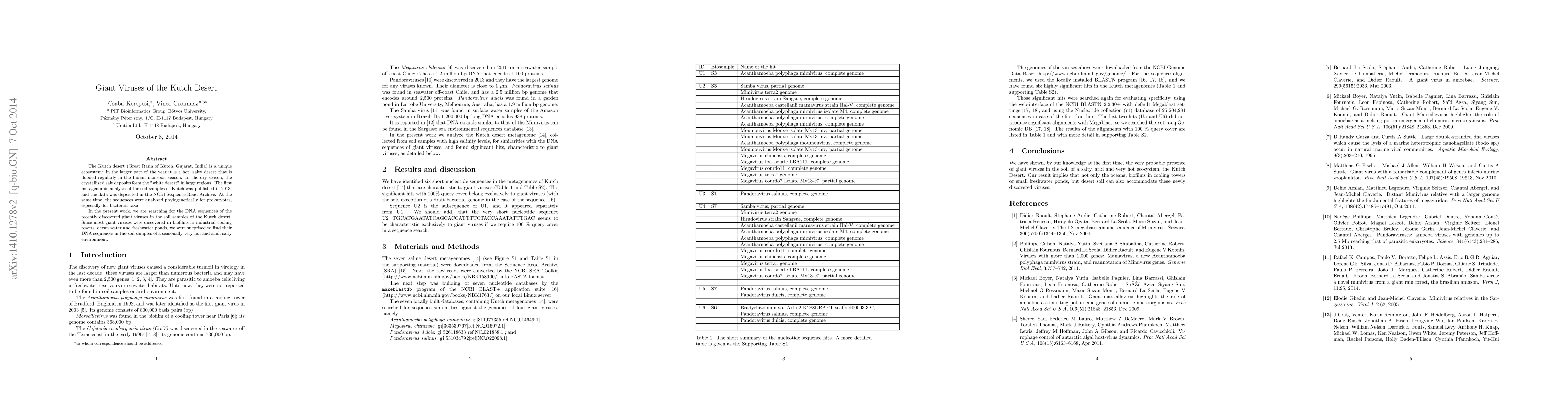 The Kutch desert (Great Rann of Kutch, Gujarat, India) is a unique ecosystem: in the larger part of the year it is a hot, salty desert that is flooded regularly in the Indian monsoon season. In the dry season, the crystallized salt deposits form the "white desert" in large regions. The first metagenomic analysis of the soil samples of Kutch was published in 2013, and the data was deposited in the NCBI Sequence Read Archive. The sequences were analyzed at the same time phylogenetically for prokaryotes, especially for bacterial taxa. In the present work, we are searching for the DNA sequences of the recently discovered giant viruses in the soil samples of the Kutch desert. Since most giant viruses were discovered in biofilms in industrial cooling towers, ocean water and freshwater ponds, we were surprised to find their DNA sequences in the soil samples of a seasonally very hot and arid, salty environment.