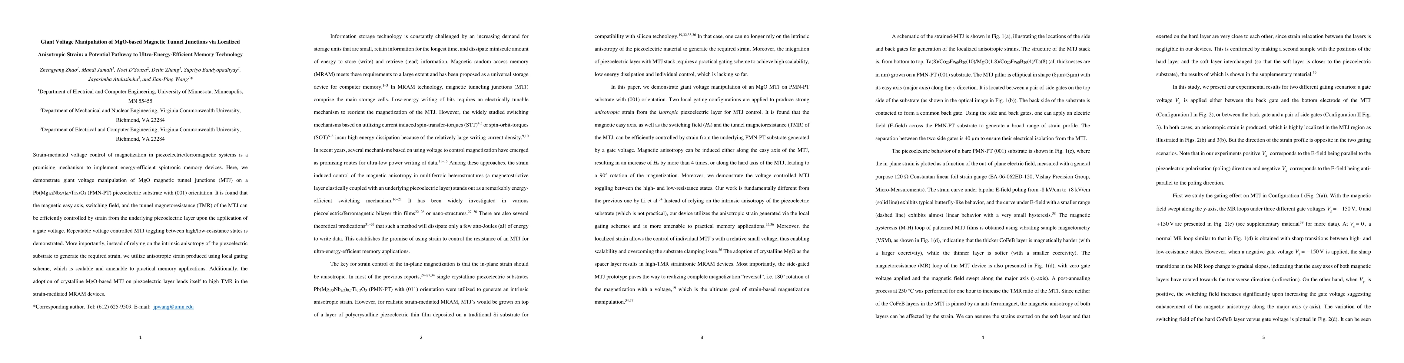 This paper demonstrates the giant voltage manipulation of MgO-based magnetic tunnel junctions (MTJ) via localized anisotropic strain on a piezoelectric substrate, showcasing a scalable pathway for ultra-energy-efficient memory technology. The study highlights the use of a local gating scheme to control the magnetic properties, enabling repeatable switching between high/low-resistance states.