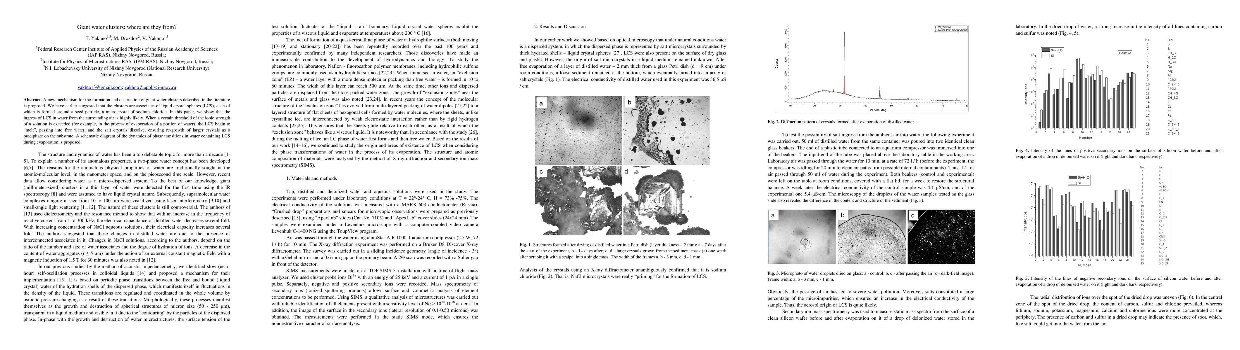 A new mechanism for the formation and destruction of giant water clusters described in the literature is proposed. We have earlier suggested that the clusters are associates of liquid crystal spheres (LCS), each of which is formed around a seed particle, a micro-crystal of sodium chloride. In this paper, we show that the ingress of LCS in water from the surrounding air is highly likely. When a certain threshold of the ionic strength of a solution is exceeded (for example, in the process of evaporation of a portion of water), the LCS begin to melt, passing into free water, and the salt crystals dissolve, ensuring re-growth of larger crystals as a precipitate on the substrate. A schematic diagram of the dynamics of phase transitions in water containing LCS during evaporation is proposed.