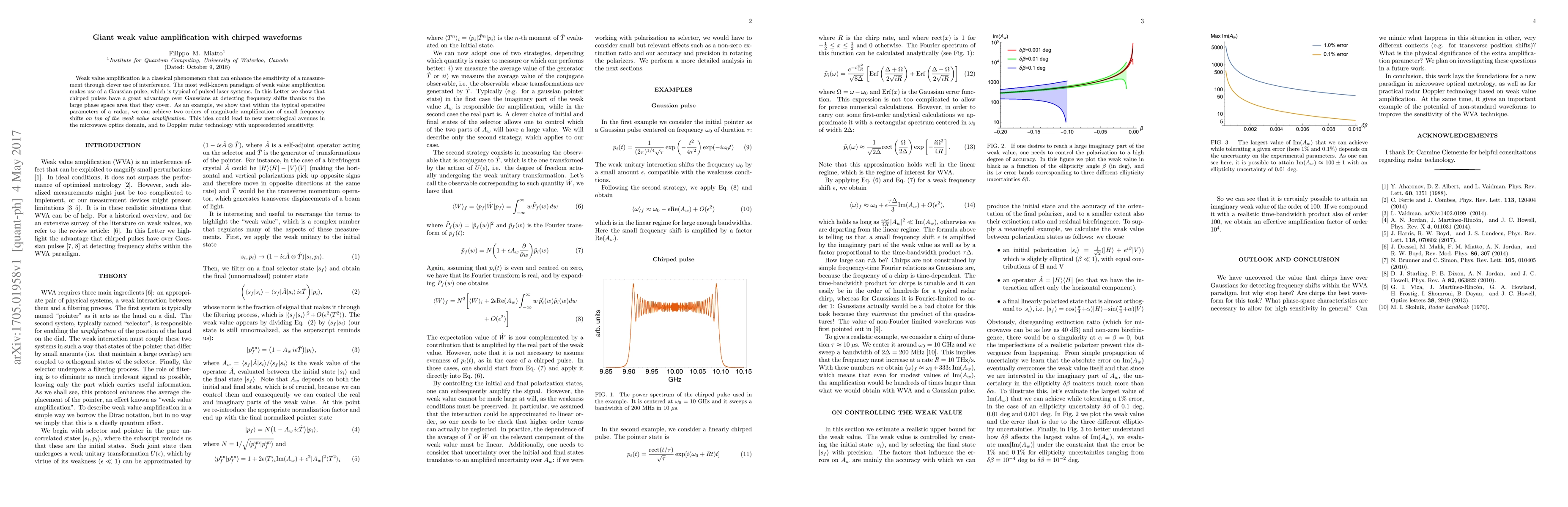 This research demonstrates that chirped pulses can significantly amplify weak value measurements, achieving two orders of magnitude greater sensitivity for detecting small frequency shifts compared to Gaussian pulses, with potential applications in radar technology and microwave optics.