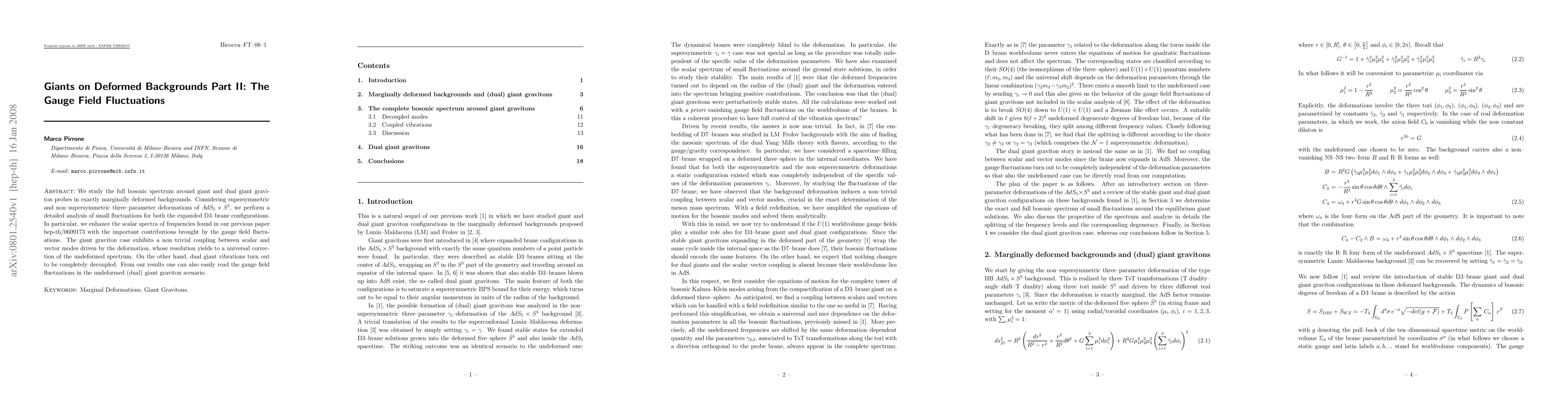 We study the full bosonic spectrum around giant and dual giant graviton probes in exactly marginally deformed backgrounds. Considering supersymmetric and non-supersymmetric three-parameter deformations of AdS_5 X S^5, we perform a detailed analysis of small fluctuations for both the expanded D3-brane configurations. In particular, we enhance the scalar spectra of frequencies found in our previous paper hep-th/0609173 with the important contributions brought by the gauge field fluctuations. The giant graviton case exhibits a non-trivial coupling between scalar and vector modes driven by the deformation, whose resolution yields to a universal correction of the undeformed spectrum. On the other hand, dual giant vibrations turn out to be completely decoupled. From our results one can also easily read the gauge field fluctuations in the undeformed (dual) giant graviton scenario.