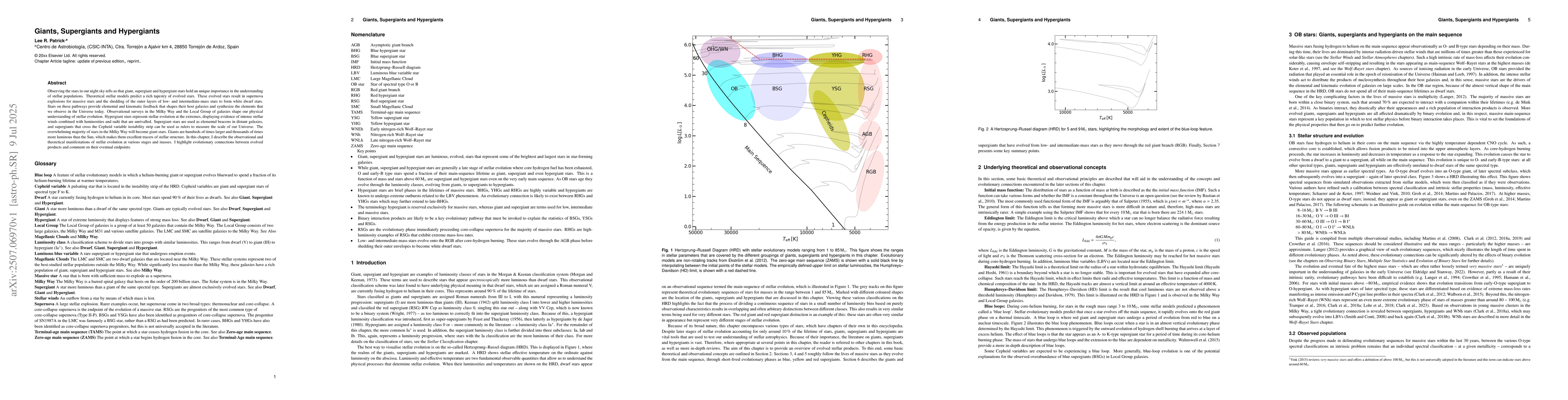 Observing the stars in our night sky tells us that giant, supergiant and hypergiant stars hold an unique importance in the understanding of stellar populations. Theoretical stellar models predict a rich tapestry of evolved stars. These evolved stars result in supernova explosions for massive stars and the shedding of the outer layers of low- and intermediate-mass stars to form white dwarf stars. Stars on these pathways provide elemental and kinematic feedback that shapes their host galaxies and synthesize the elements that we observe in the Universe today. Observational surveys in the Milky Way and the Local Group of galaxies shape our physical understanding of stellar evolution. Hypergiant stars represent stellar evolution at the extremes, displaying evidence of intense stellar winds combined with luminosities and radii that are unrivalled. Supergiant stars are used as elemental beacons in distant galaxies, and supergiants that cross the Cepheid variable instability strip can be used as rulers to measure the scale of our Universe. The overwhelming majority of stars in the Milky Way will become giant stars. Giants are hundreds of times larger and thousands of times more luminous than the Sun, which makes them excellent tracers of stellar structure. In this chapter, I describe the observational and theoretical manifestations of stellar evolution at various stages and masses. I highlight evolutionary connections between evolved products and comment on their eventual endpoints.