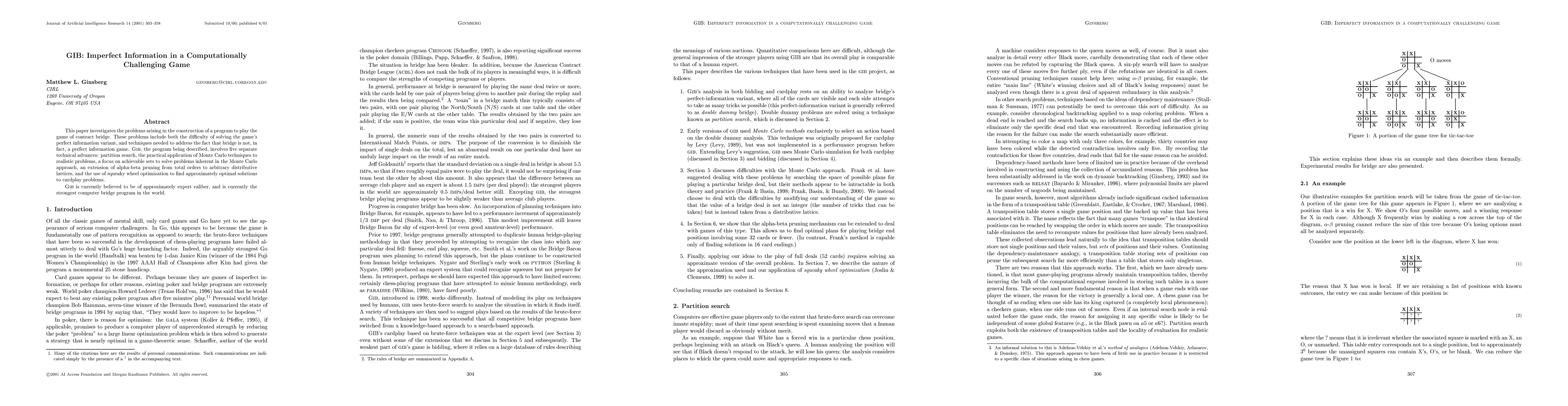 This paper investigates the problems arising in the construction of a program to play the game of contract bridge. These problems include both the difficulty of solving the game's perfect information variant, and techniques needed to address the fact that bridge is not, in fact, a perfect information game. GIB, the program being described, involves five separate technical advances: partition search, the practical application of Monte Carlo techniques to realistic problems, a focus on achievable sets to solve problems inherent in the Monte Carlo approach, an extension of alpha-beta pruning from total orders to arbitrary distributive lattices, and the use of squeaky wheel optimization to find approximately optimal solutions to cardplay problems. GIB is currently believed to be of approximately expert caliber, and is currently the strongest computer bridge program in the world.