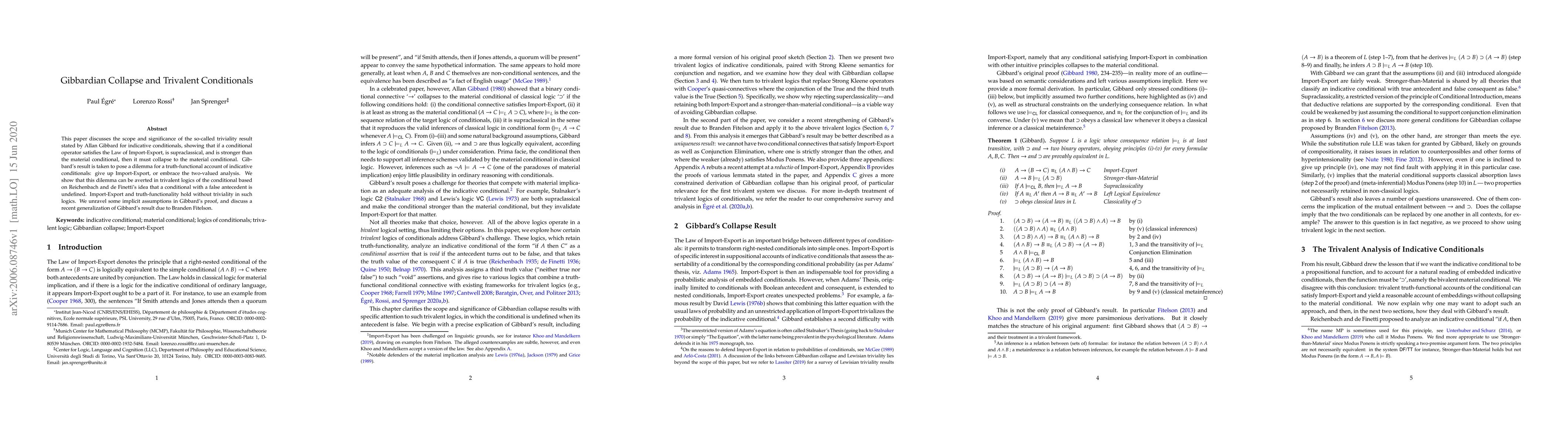 This paper explores Gibbard's triviality result for indicative conditionals, demonstrating that trivalent logics can avoid the dilemma of Import-Export laws while maintaining truth-functionality, thus preventing collapse to material conditionals. It also examines Fitelson's generalization of Gibbard's findings.