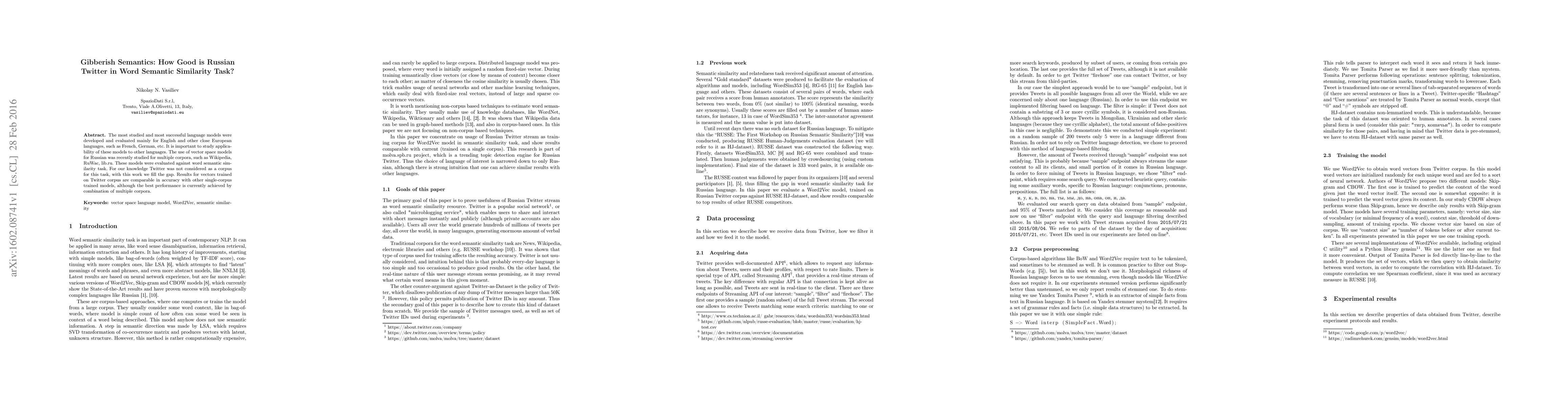 The most studied and most successful language models were developed and evaluated mainly for English and other close European languages, such as French, German, etc. It is important to study applicability of these models to other languages. The use of vector space models for Russian was recently studied for multiple corpora, such as Wikipedia, RuWac, lib.ru. These models were evaluated against word semantic similarity task. For our knowledge Twitter was not considered as a corpus for this task, with this work we fill the gap. Results for vectors trained on Twitter corpus are comparable in accuracy with other single-corpus trained models, although the best performance is currently achieved by combination of multiple corpora.