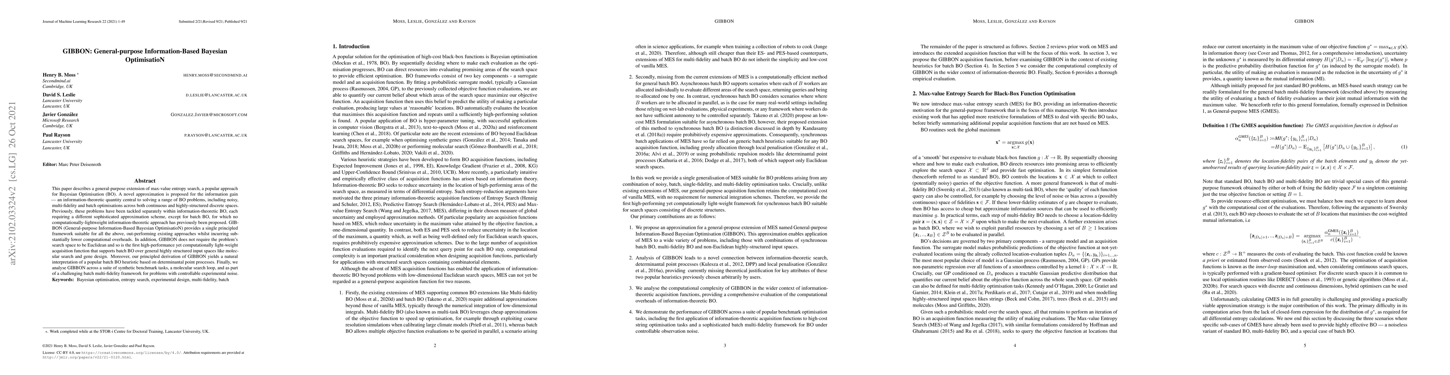 GIBBON is a general-purpose Bayesian Optimisation framework that introduces a novel approximation for information gain, enabling efficient solutions for noisy, multi-fidelity, and batch optimisation across various spaces. It outperforms existing methods with lower computational costs and supports batch optimisation over non-Euclidean spaces.