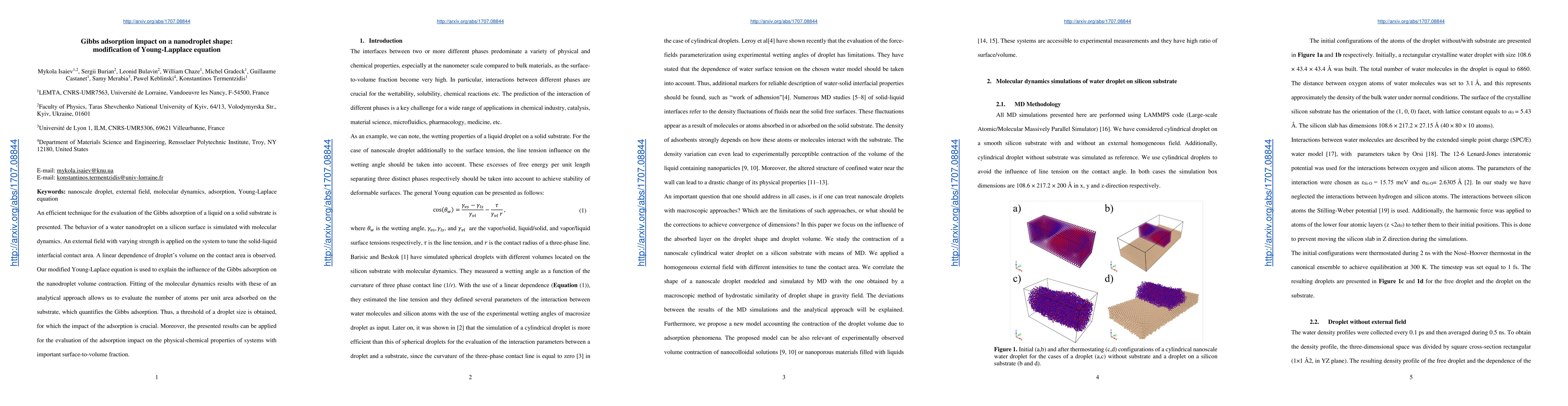 This paper presents a method for evaluating Gibbs adsorption of a liquid on a solid substrate, using molecular dynamics simulations of a water nanodroplet on silicon. The modified Young-Laplace equation explains the volume contraction of the droplet due to Gibbs adsorption, leading to a quantifiable threshold for the adsorption's impact on droplet size.