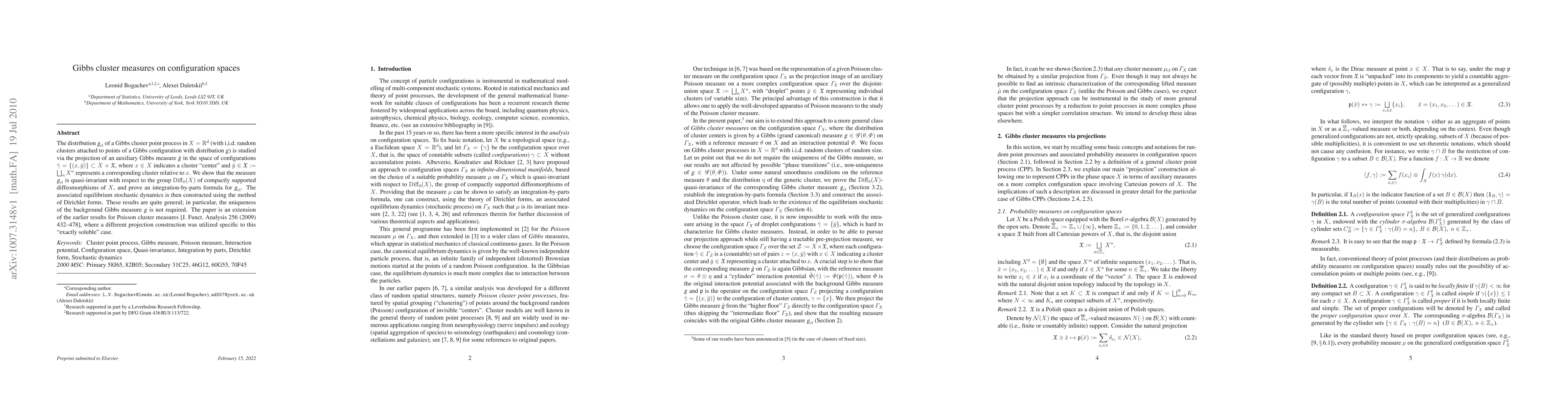 The distribution $g_{cl}$ of a Gibbs cluster point process in $X=\mathbb{R}^{d}$ (with i.i.d. random clusters attached to points of a Gibbs configuration with distribution $g$) is studied via the projection of an auxiliary Gibbs measure $\hat{g}$ in the space of configurations $\hat{gamma}=\{(x,\bar{y})\}\subset X\times\mathfrak{X}$, where $x\in X$ indicates a cluster "center" and $\bar{y}\in\mathfrak{X}:=\bigsqcup_{n} X^n$ represents a corresponding cluster relative to $x$. We show that the measure $g_{cl}$ is quasi-invariant with respect to the group $\mathrm{Diff}_{0}(X)$ of compactly supported diffeomorphisms of $X$, and prove an integration-by-parts formula for $g_{cl}$. The associated equilibrium stochastic dynamics is then constructed using the method of Dirichlet forms. These results are quite general; in particular, the uniqueness of the background Gibbs measure $g$ is not required. The paper is an extension of the earlier results for Poisson cluster measures %obtained by the authors [J. Funct. Analysis 256 (2009) 432-478], where a different projection construction was utilized specific to this "exactly soluble" case.