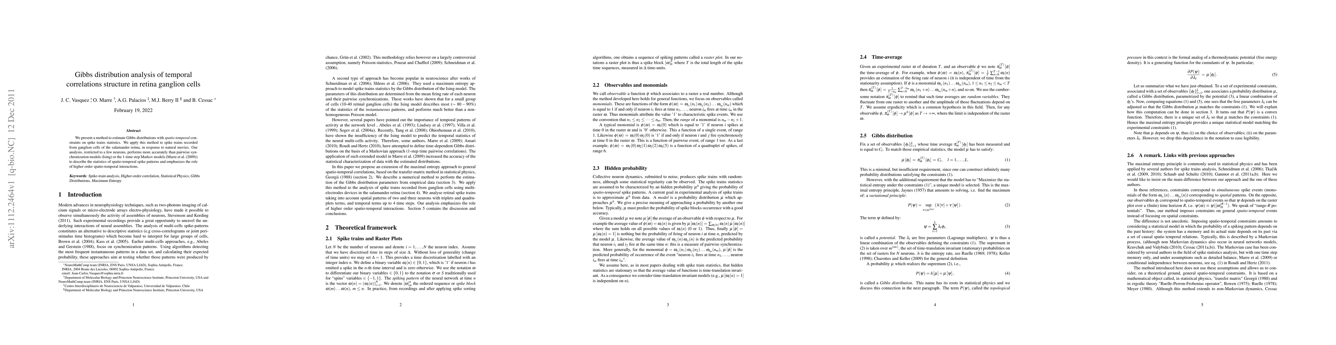 We present a method to estimate Gibbs distributions with \textit{spatio-temporal} constraints on spike trains statistics. We apply this method to spike trains recorded from ganglion cells of the salamander retina, in response to natural movies. Our analysis, restricted to a few neurons, performs more accurately than pairwise synchronization models (Ising) or the 1-time step Markov models (\cite{marre-boustani-etal:09}) to describe the statistics of spatio-temporal spike patterns and emphasizes the role of higher order spatio-temporal interactions.