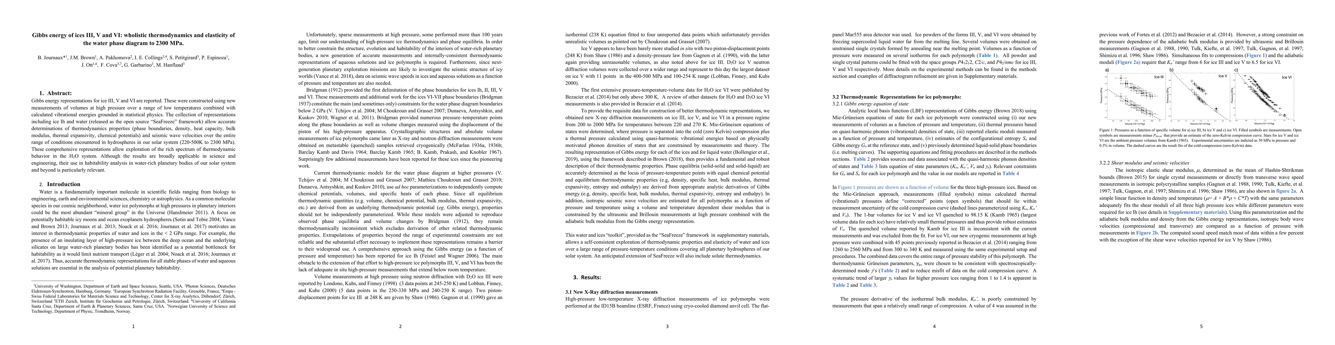 Gibbs energy representations for ice III, V and VI are reported. These were constructed using new measurements of volumes at high pressure over a range of low temperatures combined with calculated vibrational energies grounded in statistical physics. The collection of representations including ice Ih and water (released as the open source SeaFreeze framework) allow accurate determinations of thermodynamics properties (phase boundaries, density, heat capacity, bulk modulus, thermal expansivity, chemical potentials) and seismic wave velocities over the entire range of conditions encountered in hydrospheres in our solar system (220 - 500K to 2300 MPa). These comprehensive representations allow exploration of the rich spectrum of thermodynamic behavior in the H2O system. Although the results are broadly applicable in science and engineering, their use in habitability analysis in water-rich planetary bodies of our solar system and beyond is particularly relevant.