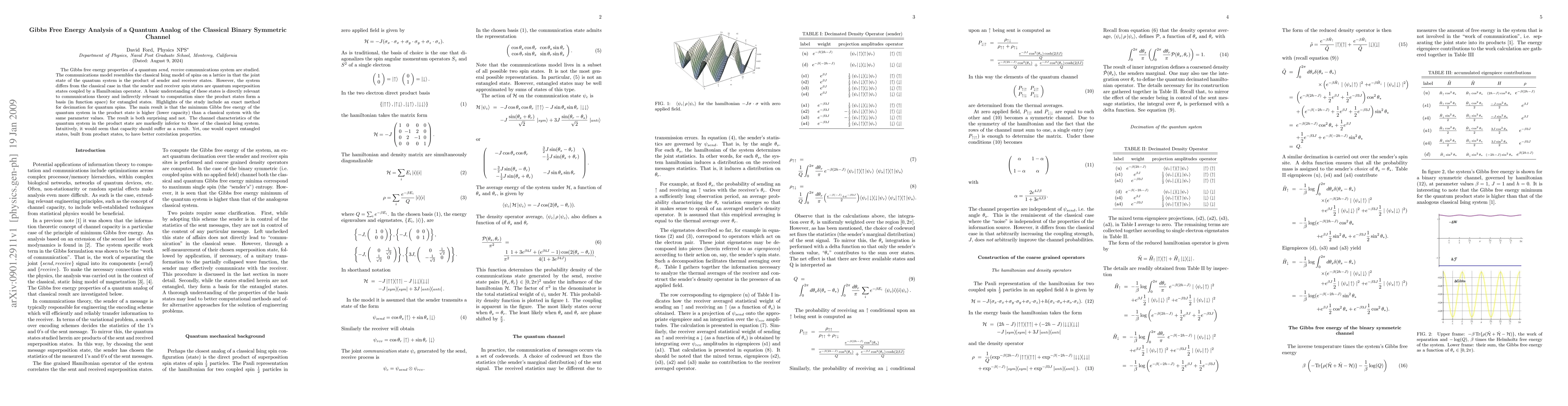 The Gibbs free energy properties of a quantum {\it send, receive} communications system are studied. The communications model resembles the classical Ising model of spins on a lattice in that the joint state of the quantum system is the product of sender and receiver states. However, the system differs from the classical case in that the sender and receiver spin states are quantum superposition states coupled by a Hamiltonian operator. A basic understanding of these states is directly relevant to communications theory and indirectly relevant to computation since the product states form a basis for entangled states. Highlights of the study include an exact method for decimation for quantum spins. The main result is that the minimum Gibbs free energy of the quantum system in the product state is higher (lower capacity) than a classical system with the same parameter values. The result is both surprising and not. The channel characteristics of the quantum system in the product state are markedly inferior to those of the classical Ising system. Intuitively, it would seem that capacity should suffer as a result. Yet, one would expect entangled states, built from product states, to have better correlation properties.