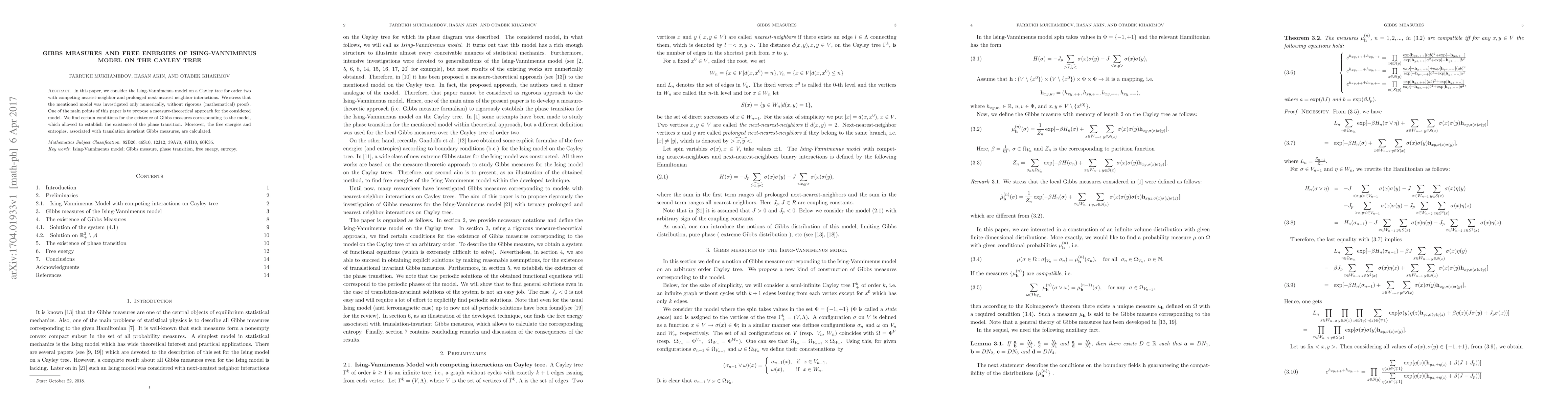 This paper introduces a measure-theoretical approach to rigorously analyze the Ising-Vannimenus model on a Cayley tree, establishing conditions for Gibbs measures and proving the existence of a phase transition. It also calculates the free energies and entropies linked to translation invariant Gibbs measures.