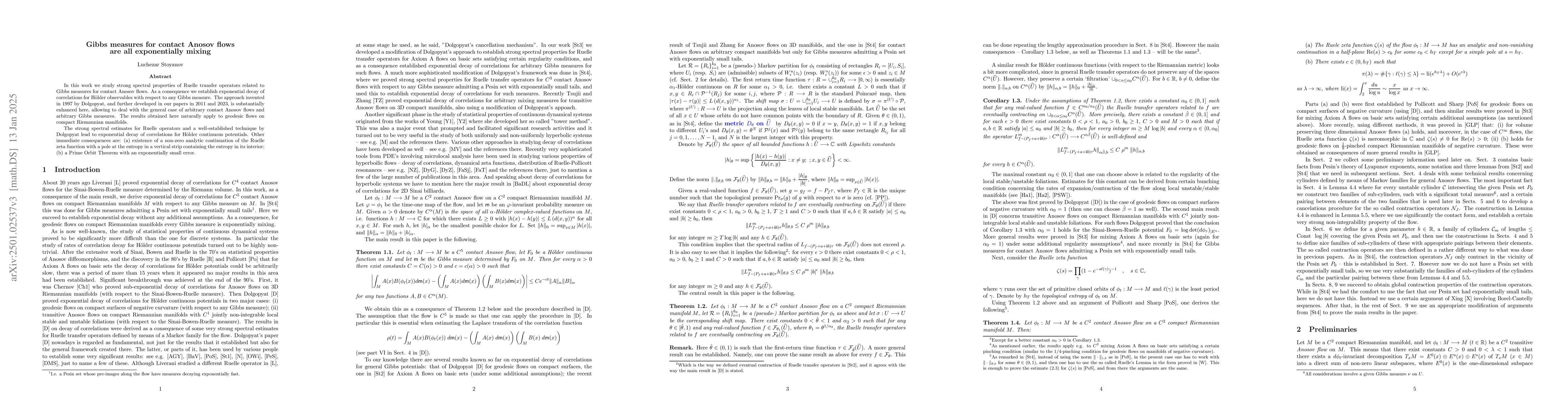 This paper establishes exponential decay of correlations for Gibbs measures in contact Anosov flows using enhanced spectral properties of Ruelle transfer operators. The approach, developed since 1997, now applies broadly to various contact Anosov flows and Gibbs measures, with implications for geodesic flows on compact manifolds.
